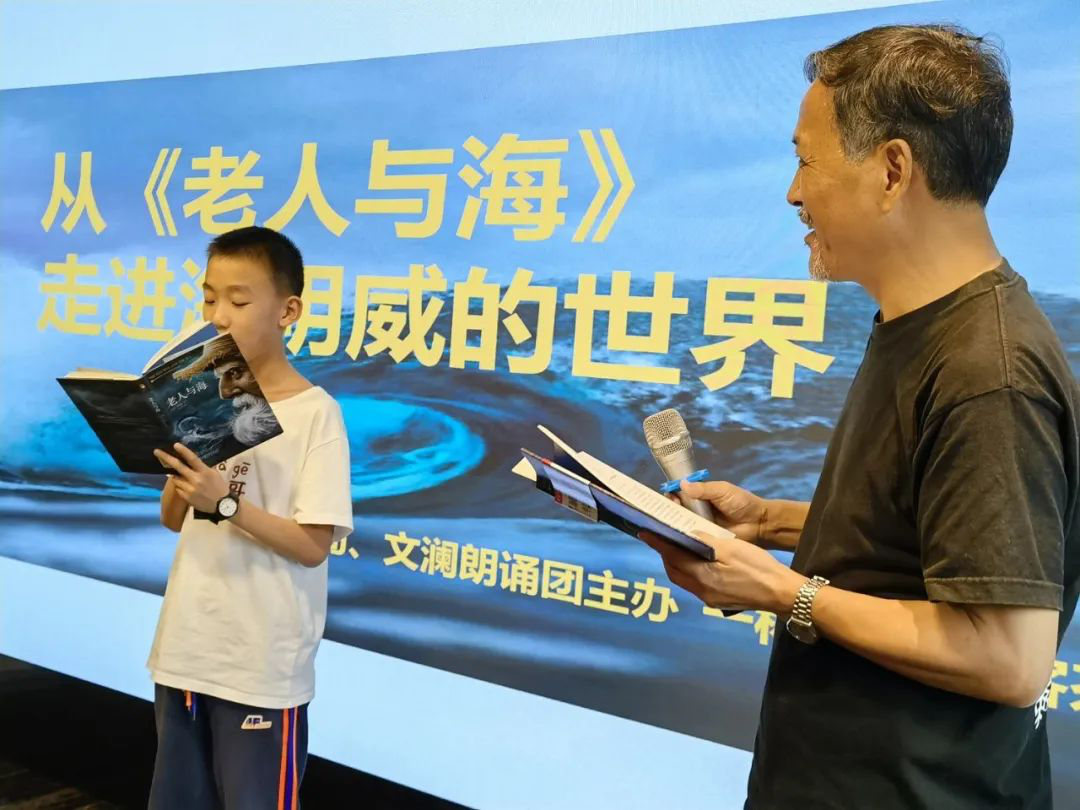 接龙朗读真正实现了全员参与。参与活动的读者每人阅读两页,击鼓传花式地读下去。不管普通话是否准确,朗读水平是否专业,朗读者一律十分投入,用自己的方式,把海明威笔下的情境生动地展现出来。有书友表示,听着朗读,我仿佛走进了海明威的小说里,身临其境,活动的高潮是一老一少两位朗读者对《老人与海》的演绎。互动讨论环节,从一老一少两位朗读者口中缓缓流溢,引发现场书友的热烈掌声。