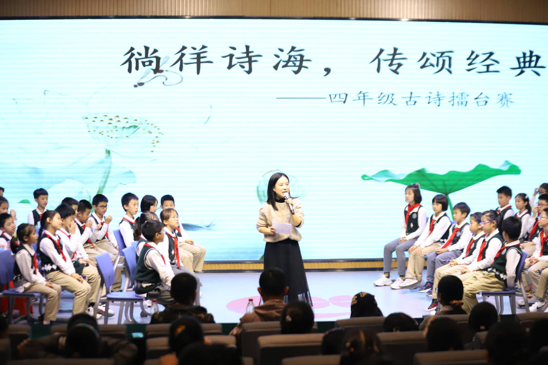 吟诵诗词是中华传统文化的精华。读诗、背诗、赛诗,四年级的同学们徜徉在诗海中,欣赏“白日依山尽,黄河入海流”的壮丽山河,体验“乱石穿空,惊涛拍岸,卷起千堆雪”的雄浑壮志。