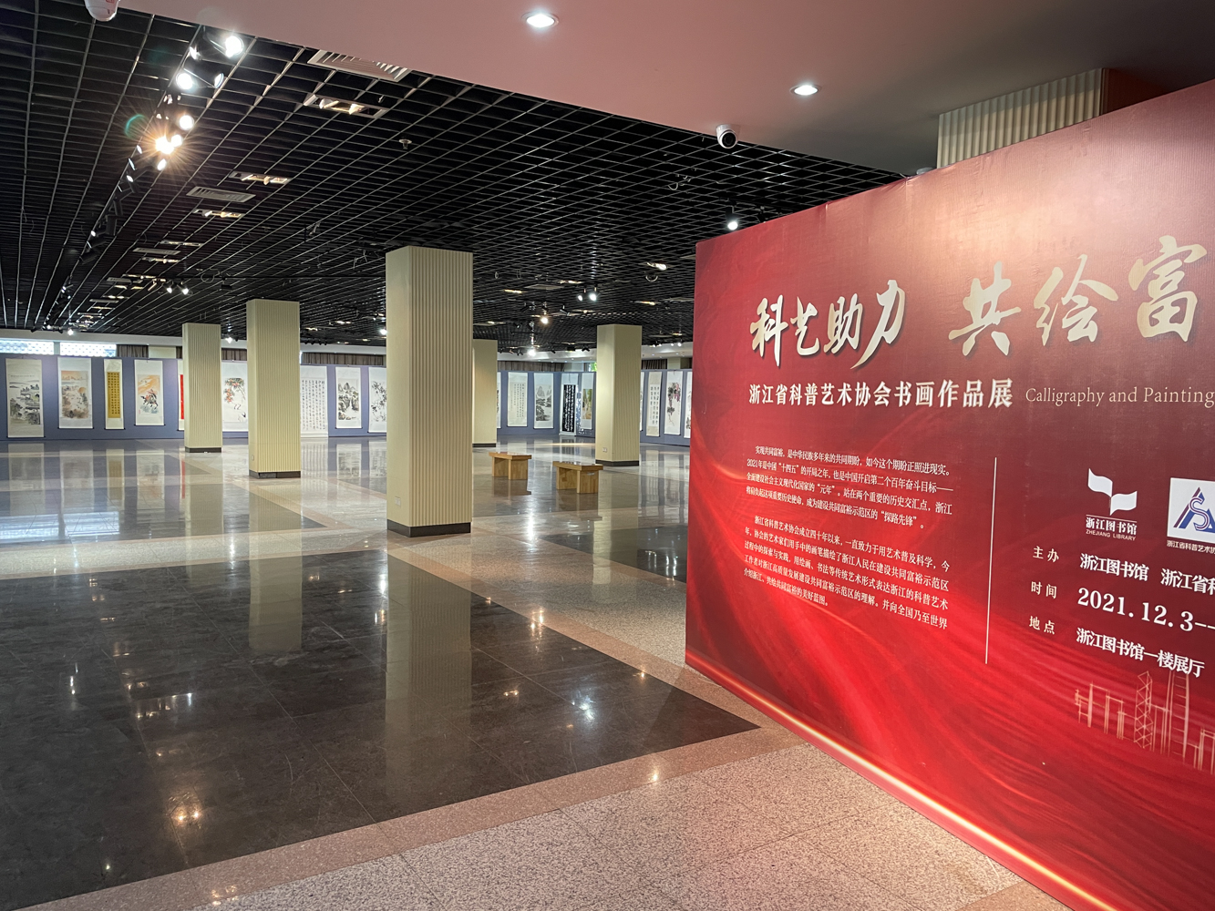 12月3日至12月8日,由浙江图书馆、浙江省科普艺术协会主办的“科艺助力 共绘富裕” 浙江省科普艺术协会书画作品展在浙江图书馆展出。协会的艺术家用手中的画笔描绘了浙江人民在建设共同富裕示范区过程中的探索与实践,用绘画、书法等传统艺术形式表达浙江的科普艺术工作者对浙江高质量发展建设共同富裕示范区的理解。