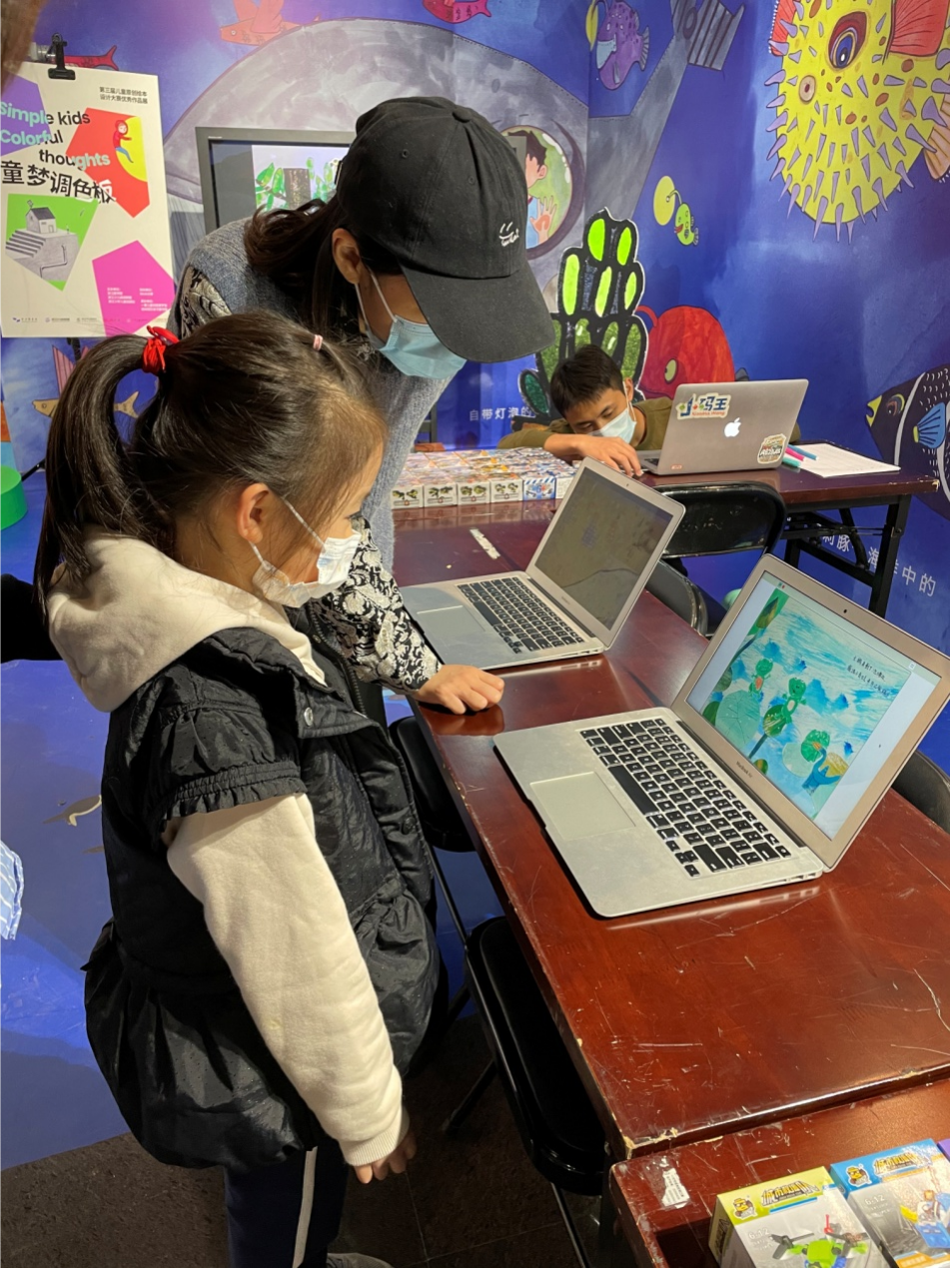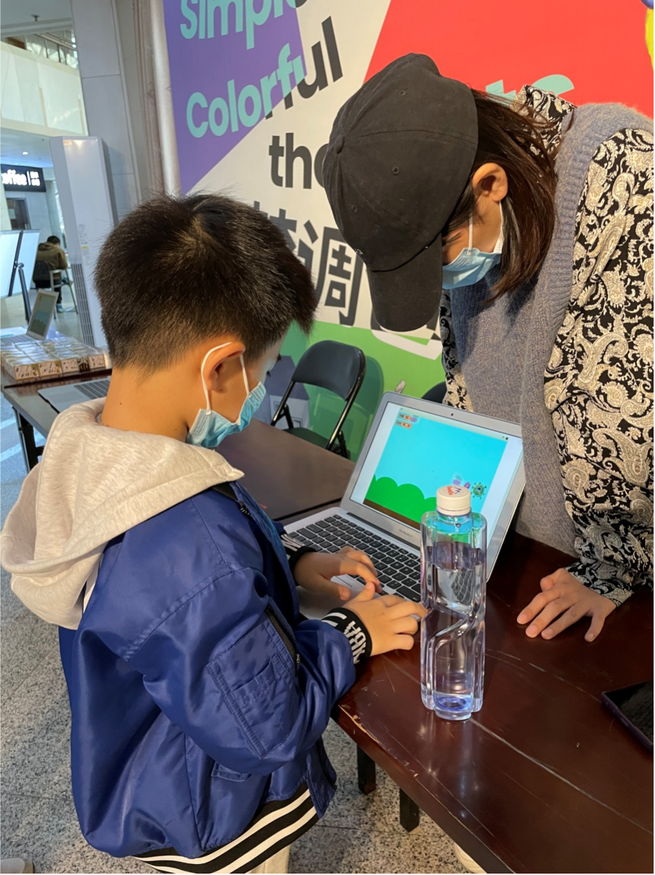展厅门口的电视屏幕循环播放着动画作品,展示着小朋友们的精彩创意。活动现场吸引了许多小朋友驻足体验,小码王的老师们为他们仔细地讲解了:绘本是如何动起来的,声音又是如何出现的,故事又是如何连贯的。还精心地准备了编程闯关小游戏,只要闯关成功就可以领取礼品一份。