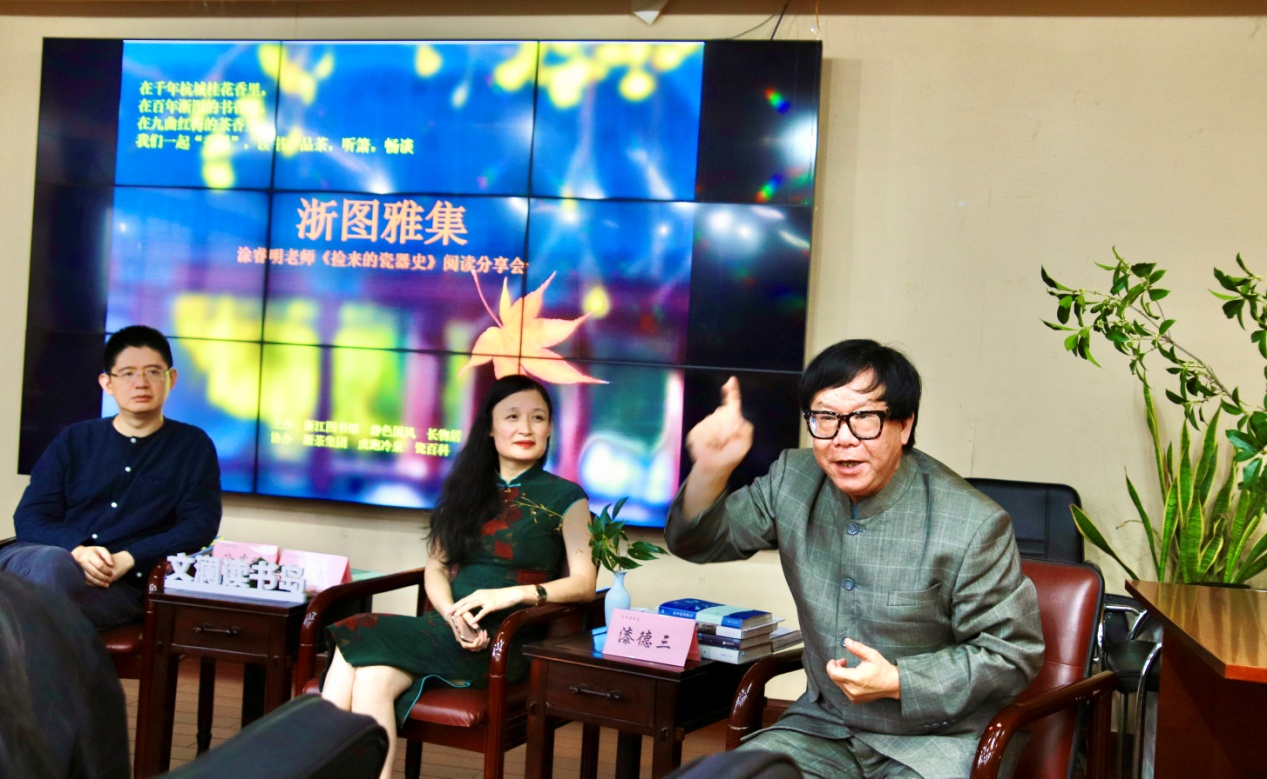 2021年10月16日,在浙江图书馆集体视听室举办的“文澜读书岛”《捡来的瓷器史》阅读分享会,是一场集视觉、听觉、味觉享受于一体的中华传统文化饕餮盛宴。来自景德镇的陶瓷文化研究者、作家、收藏家涂睿明讲述五光十色的瓷片里的中国瓷器史;同时还有来自杭州的松风寒的箫演奏;以及茶艺师们烹制的醇香普洱和茶点桂花糕。