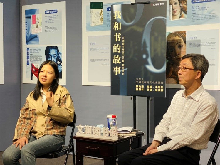 文澜读书岛第100期阅读分享会的主题为“我和书的故事”,在“阅读、碰撞、分享的百种探索”展览现场,邀请了7位书友讲述他们的阅读故事。来自湖北恩施的胡其伟通过钉钉连线讲述了他家三代人爱书读书的遗传,分享了他从图书漂流中得到的快乐,展示了他图文并茂的手账式读书笔记。第二位分享的林捷是文澜读书岛的老朋友,她来自浙江诸暨,是一位基层公务员,同时是一位有影响力的自然爱好者,她介绍了自己按照“踏石留印,抓铁有痕”原则进行阅读的体会,正因为这样孜孜不倦的坚持,至今她已经组织起一个覆盖全国的“一木自然学院读书会”,编写了两本《可以玩一年的自然游戏》,受到全国各地自然爱好者的欢迎。