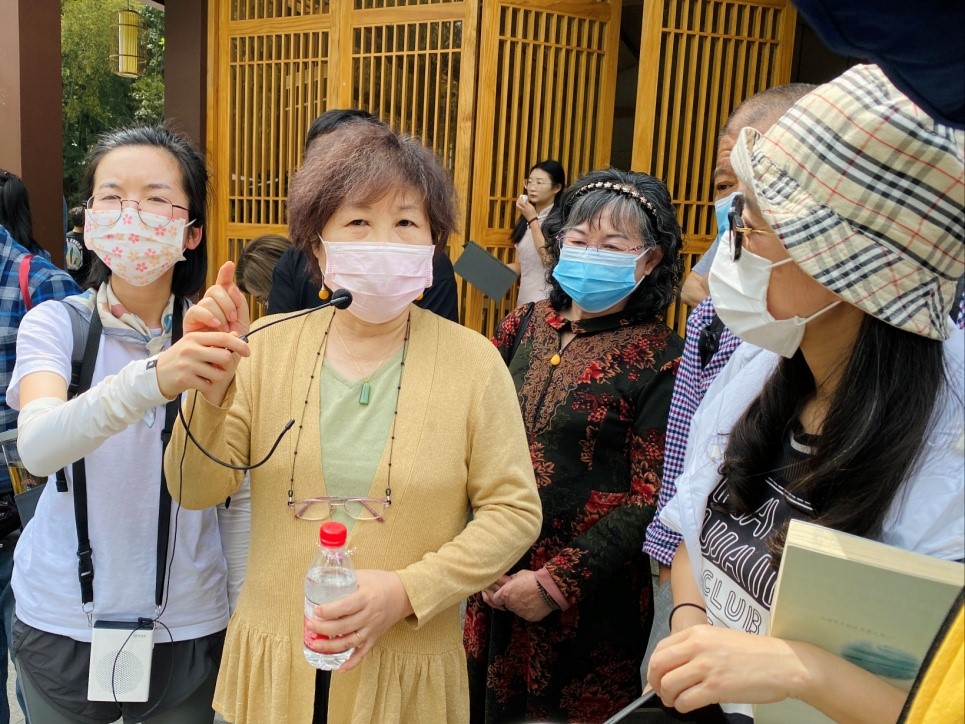 在出发地玉泉观鱼景点,王旭烽讲到她在《茶人三部曲》第二部《不夜之侯》里写到的杭嘉草之死的故事是有真实历史原型的。日军侵入杭州后,用手榴弹把玉泉里的大鱼都炸死了,然后用步枪抬着大鱼回营房。这张照片后来刊登在日本的报纸上,传回了中国。照片上的大鱼有将近一人高。由这张老照片,王旭烽构思了“嘉草之死”的故事,强烈地展现了国破家亡的主题。在《茶人三部曲》第三部《筑草为城》中,杭汉与叶子借了家门口的垃圾车,把病危的杭嘉平送进了浙江医院。嘉平为了宽宥兄长嘉和的心,打趣地指着墙头的瓦楞草说:“你看这墙头,别样东西不生,单单这两株草生得好,又是南北对峙,我看正好叫做‘双峰插云’。”嘉平借用的正是浙江医院门口的双峰插云景点。走读第三站是盖叫天之墓,盖叫天原名张英杰,是著名京剧表演艺术家,有“江南活武松”之称。