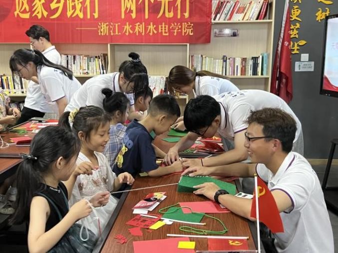 在活动中,来自浙江水利水电学院的志愿者为孩子们讲述了“安吉的青山绿水,共富班车之路”“新四军浙西留守处在安吉的艰险斗争”“梦想与希望,坚持与成长”及“彼方尚有荣光在”的红色激励故事。孩子们端坐在书香环绕的图书馆里,认真聆听革命故事,沐浴红色文化的洗礼。宣讲结束后,工作人员组织大家动手制作党旗和红军包,并一起学唱了红色革命歌曲。