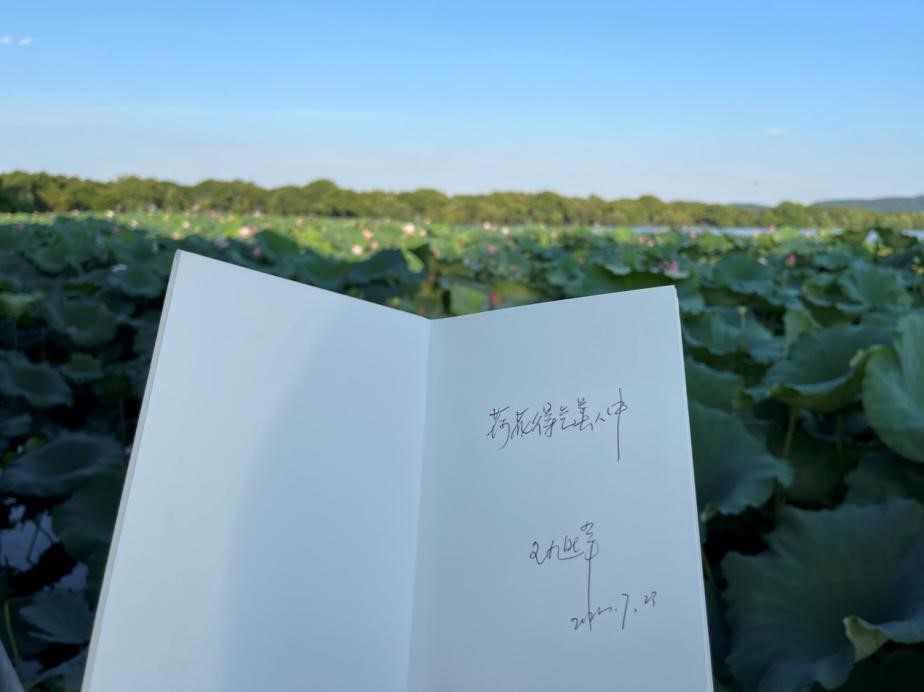 在荷花环抱的茶楼里,听着劳月和红坚老师的朗诵,喝着带有豆奶香的龙井茶,欣赏着翠绿的莲蓬杯垫,文澜读书岛的这场阅读分享会令读者享受到了文学之美、荷花之美。此次活动为“西湖十景系列活动”中的一场,上一次小说改编同名电影《柳浪闻莺》为契机,在“柳浪闻莺”景点进行了同名小说的讨论阅读。而下一次将以秋日赏月为主题,泛舟“三潭印月”,饮茶读书品月。