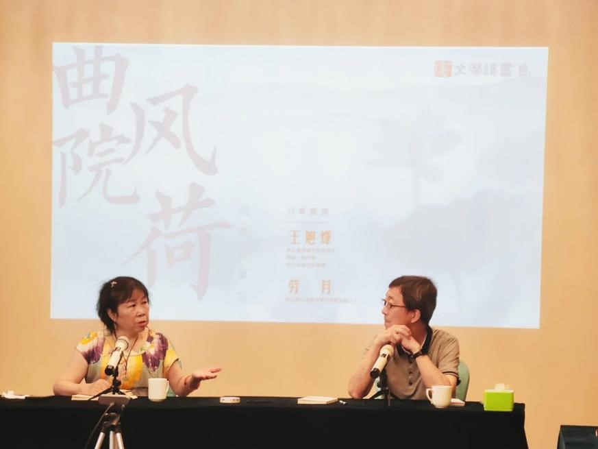 王旭烽首先与读者们交流了小说的“写什么”与“怎么写”,王旭烽的《西湖十景》每一本都有一个终极的哲学命题。《曲院风荷》写的是宗教,放纵与禁锢就是其中的哲学命题。书中的主人公赫明、聊无、聊胜,无不在放纵与禁锢之间纠结不已。荷花则是放纵与禁锢命题的最好意象。印度人认为,荷花是世界的子宫,这个世界是从荷花中孕育出来的。荷花出淤泥而不染,濯清涟而不妖。它的清纯形象和它所处的污浊环境形成鲜明的对照,从而也成为佛教经典中重要的意象。王旭烽认为,对滚滚红尘的欲望正是一种强烈的生命力,遏制欲望是不道德的,所以她不赞成两姐妹的出家,不赞成女人裹小脚。但反过来,放纵欲望,沉溺在欲望之中,则会毁灭一个人。我们不必去回避对欲望的描写,而应该给欲望予以正名。《曲院风荷》的结局用亦真亦幻的手法,描写了一个纯真无邪的男欢女爱场景,与前面写到过的赫明与聊胜做爱的场景形成对照。这正是对纯洁生命的歌颂。