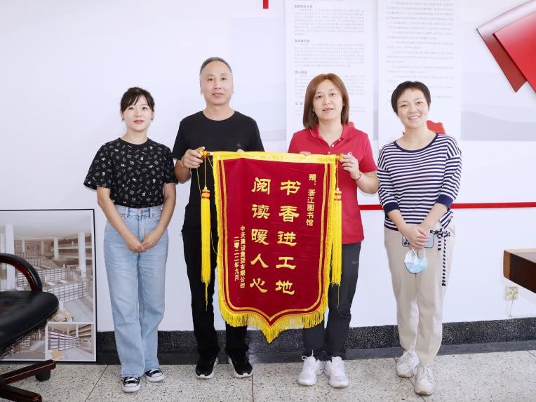 2022年9月20日下午,中天建设集团公司第二建设分公司党委书记金鹰一行6人专程来到浙江图书馆,赠送书写着“书香进工地 阅读暖人心”的锦旗,以此表示对浙江图书馆的感谢。浙江图书馆副馆长朱晔琛接受锦旗并表示,为全省读者提供均等化、无边界的文化服务是公共图书馆应尽的责任。