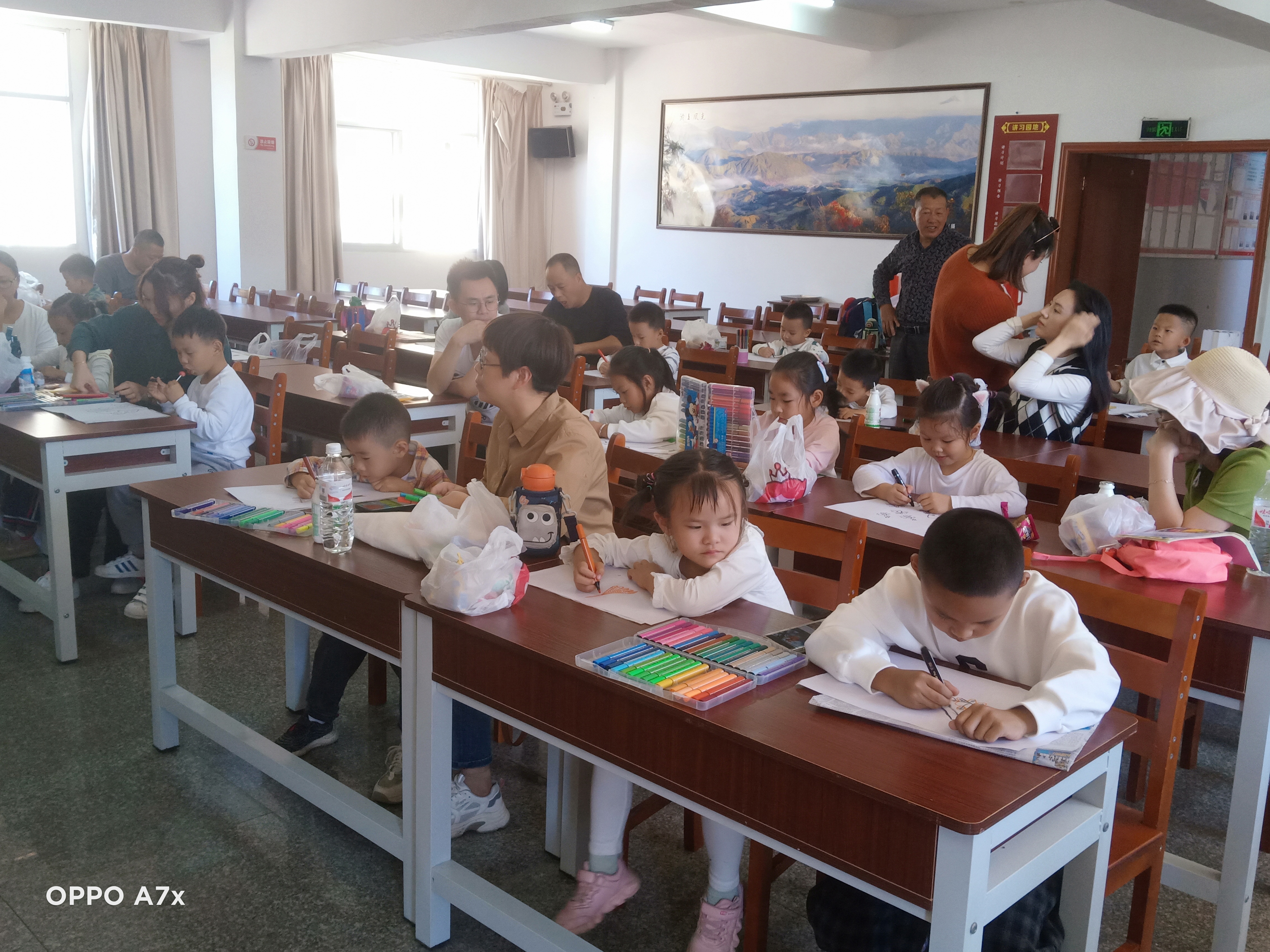 除了体验现场阅读,老师还教大家亲手绘制图画。孩子们热情高涨,拿起五颜六色的画笔兴致勃勃地在纸上涂鸦起来,尽情挥洒他们绚丽多彩的童心。