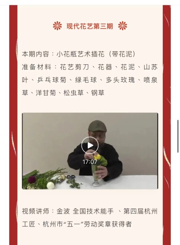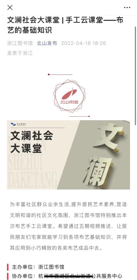 “工艺编绳”和“现代花艺”云课堂共10期,在新春假期里,进行了“巧手庆佳节”的活动推送,为广大读者送上了丰富的线上资源。联合杭州市西湖区北山街道公共服务中心推出的5期“手工布艺”云课堂,丰富了社区群众的业余生活,提高了居民的艺术素养,营造了文明和谐的社区文化氛围。