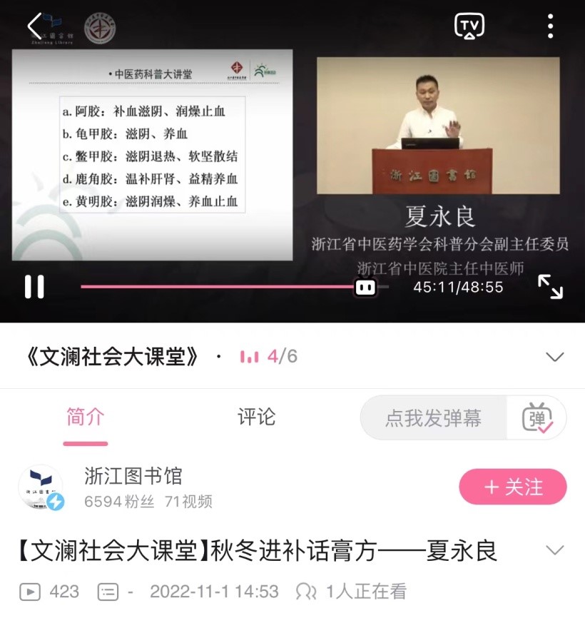 夏永良主任的科普视频在浙江图书馆b站官方账号推送