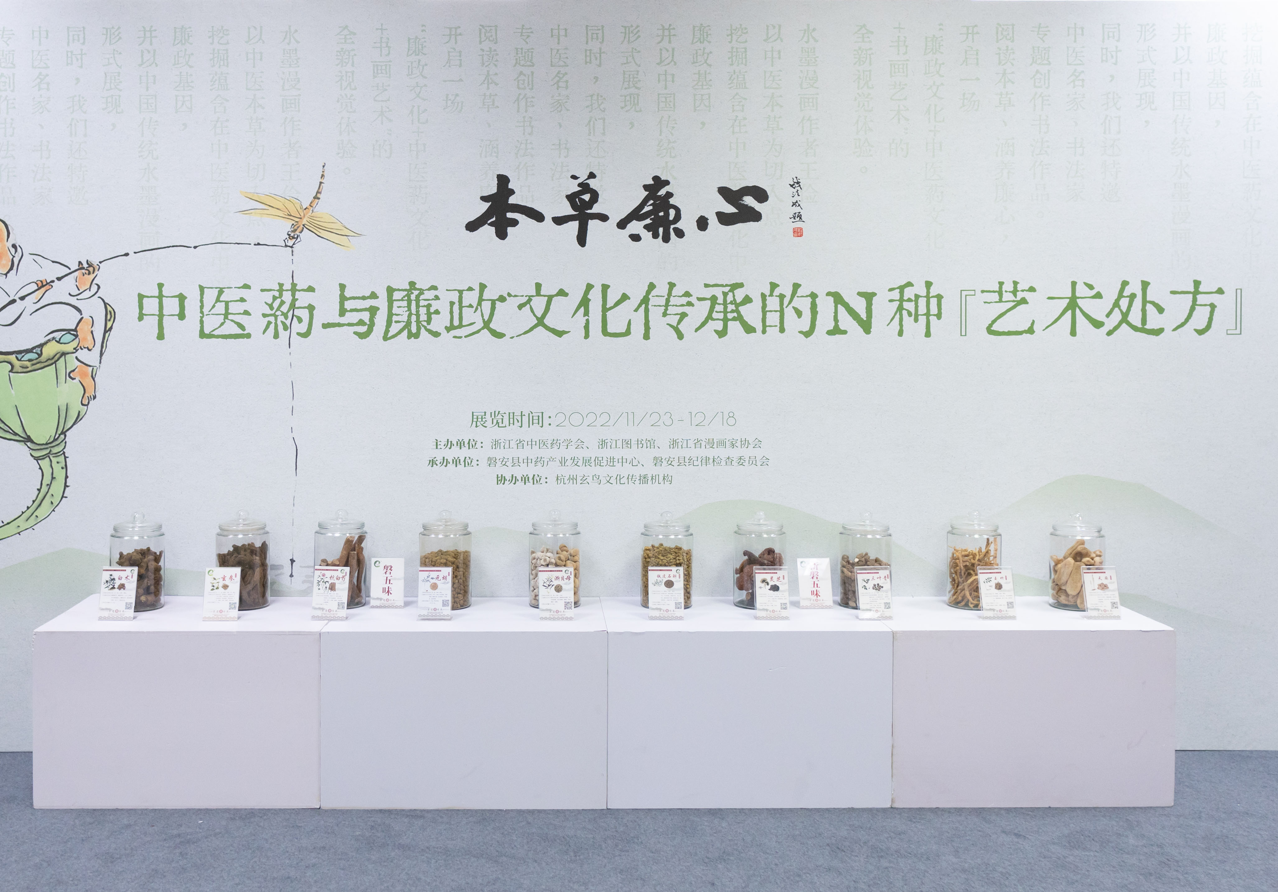 11月23日,由浙江省中医药学会、浙江图书馆、浙江省漫画家协会主办,磐安县中药产业发展促进中心、磐安县纪律检查委员会承办,杭州玄鸟文化传播机构协办的“本草廉心:中医药与廉政文化传承的N种‘艺术处方’”主题展览在浙江图书馆二楼回廊开幕。