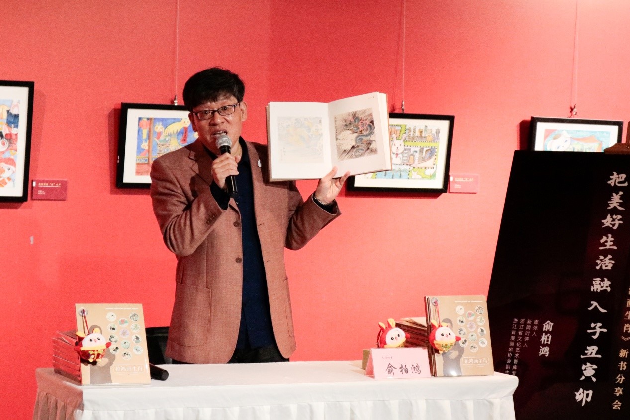 1月19日下午,腊月二十八的浙江图书馆,年味儿十足,展厅正在展出“玉兔呈祥——生肖主题漫画剪纸展”,来自浙江省漫画家协会的漫画家们来到图书馆和读者共同喜迎新春,开展“把美好生活融入子丑寅卯——文澜约书《柏鸿画生肖》阅读分享会”主题活动。