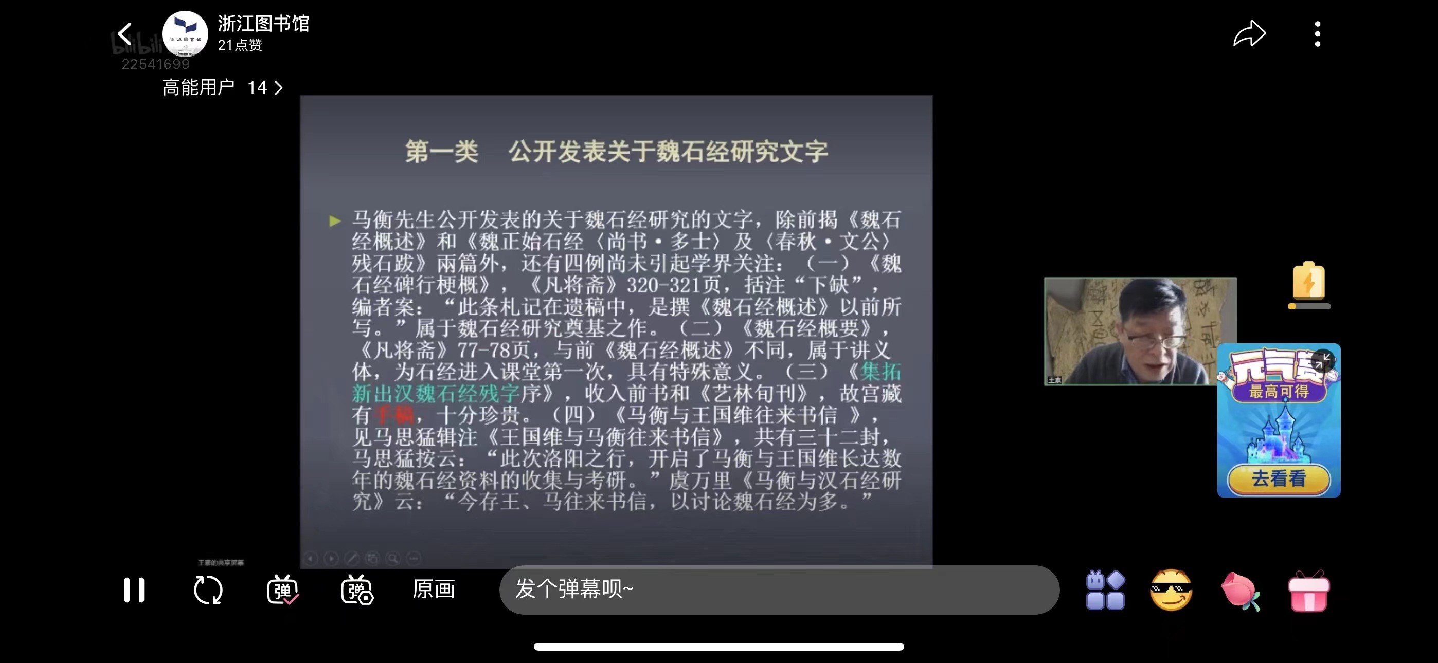 周日晚19:30,由故宫博物院研究员王素先生带来的线上主题讲座《马衡先生金石学四题——石刻讲义东传与甲骨、简牍、魏石经研究》准时在浙江图书馆B站官方账号播出。