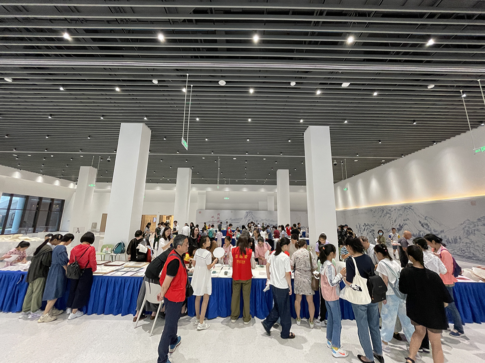 2023年8月29日14:00,浙江图书馆之江馆正式向读者开放,天空的细雨显然无法阻挡读者的热情。之江馆负一层展厅近百张桌子组成的四条长龙上摆满了第五批国家级非物质文化遗产项目雕版印刷技艺(杭州雕版印刷技艺)代表性传承人黄小建的雕版作品。这些雕版是黄老师的得意之作,平时并不轻易拿出来示人,更别说是给读者印刷体验。