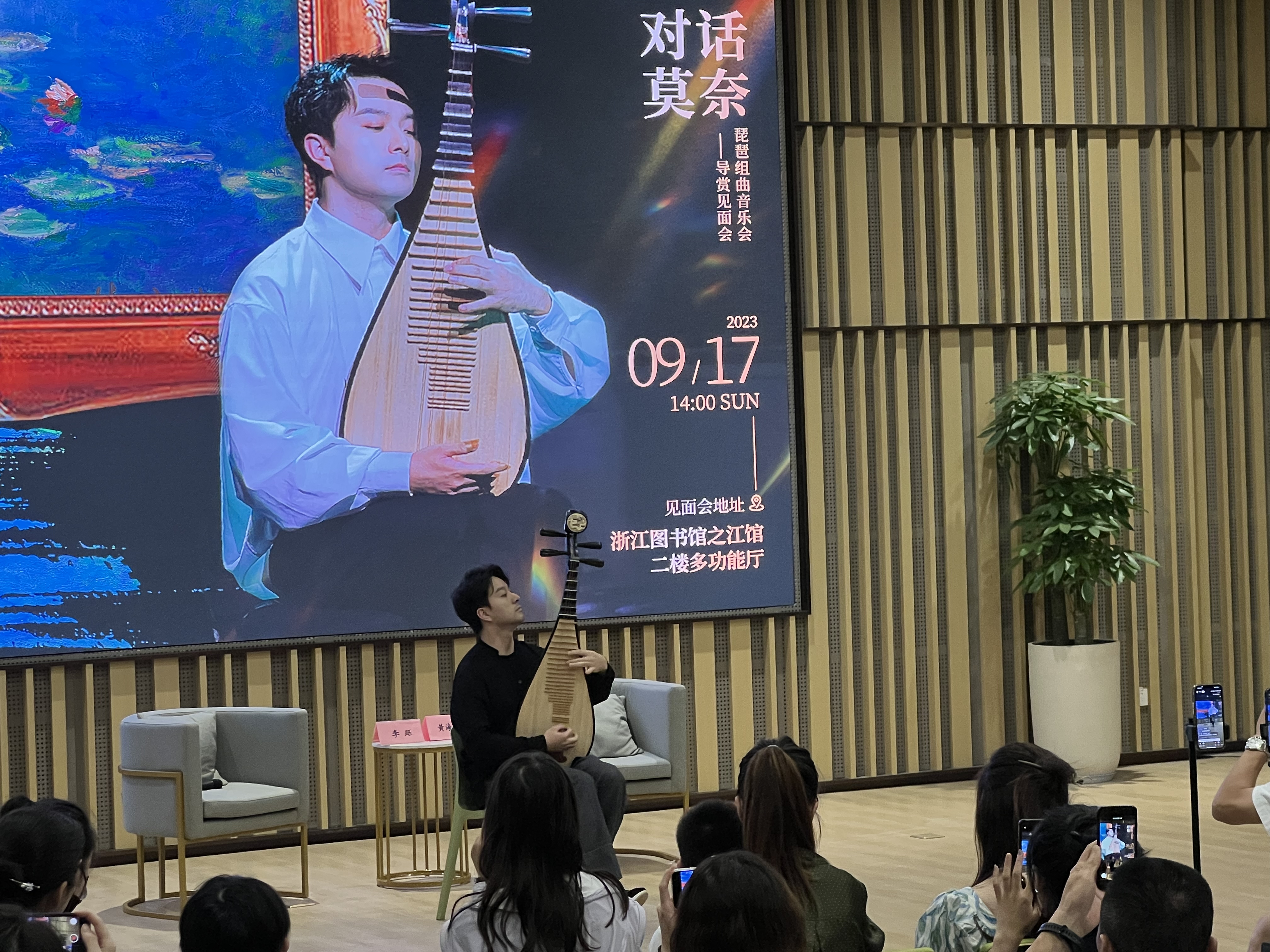 9月17日下午14:00,在浙江图书馆之江馆二楼多功能厅,来自浙江音乐学院的李跞老师,在此开展了一场有关《对话莫奈》琵琶组曲音乐会的导赏见面会。本次活动是浙江图书馆之江馆开馆以来二楼多功能厅的第一次使用,我们邀请到了青年琵琶演奏家的李跞老师,以及浙江图书馆文澜朗诵团的黄海敏老师为主持嘉宾,在现场通过交流与演绎的形式,带领大家走进李跞老师视角下的《对话莫奈·琵琶组曲音乐会》。让来到现场的观众,能够更好的了解以莫奈的画作为灵感而全新创作的音乐作品,让观众仿佛置身于光影与色彩的波澜中,感受音乐的浪漫。