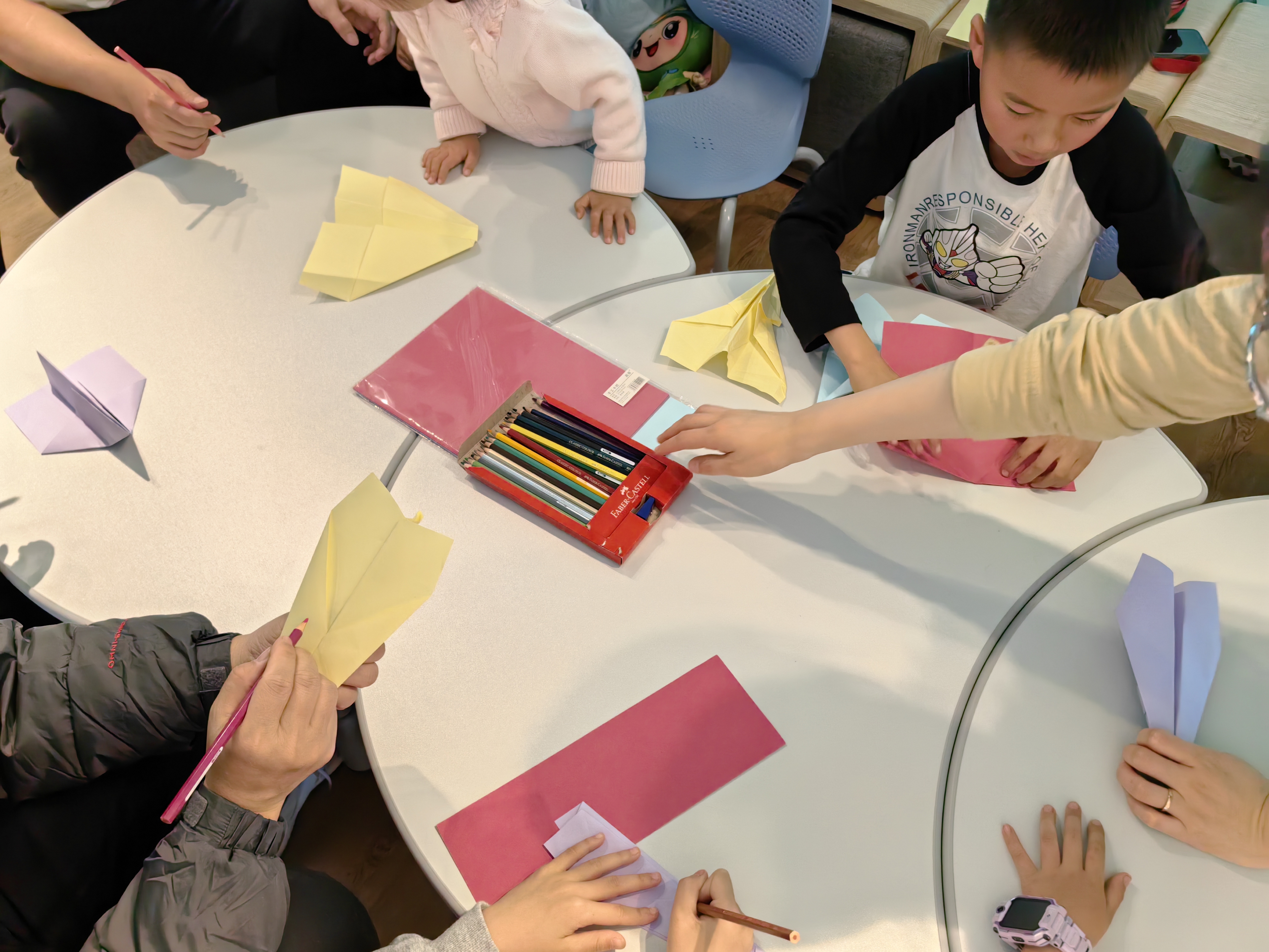 到场幼儿专注地制作着属于自己的纸飞机,每个人的奇妙设计中体现了童趣与想象。家长和小朋友一起写下了家庭美好的愿望,共同放飞。五彩斑斓的纸飞机起飞,光影交织着欢声笑语,将科技文明的种子播撒在儿童心田。