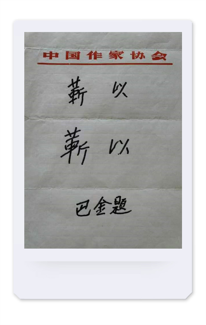 在金峰收藏的部分巴金手稿中,有一张稿纸令人印象深刻:这是一张普通的稿纸,上面两行“靳以”。金峰说,这是巴金晚年的笔记,原是巴金准备赠与好友靳以之题字,但由于先生卧病在床,一时忘记“靳”字的写法,便重复留下这两行特别的墨迹。