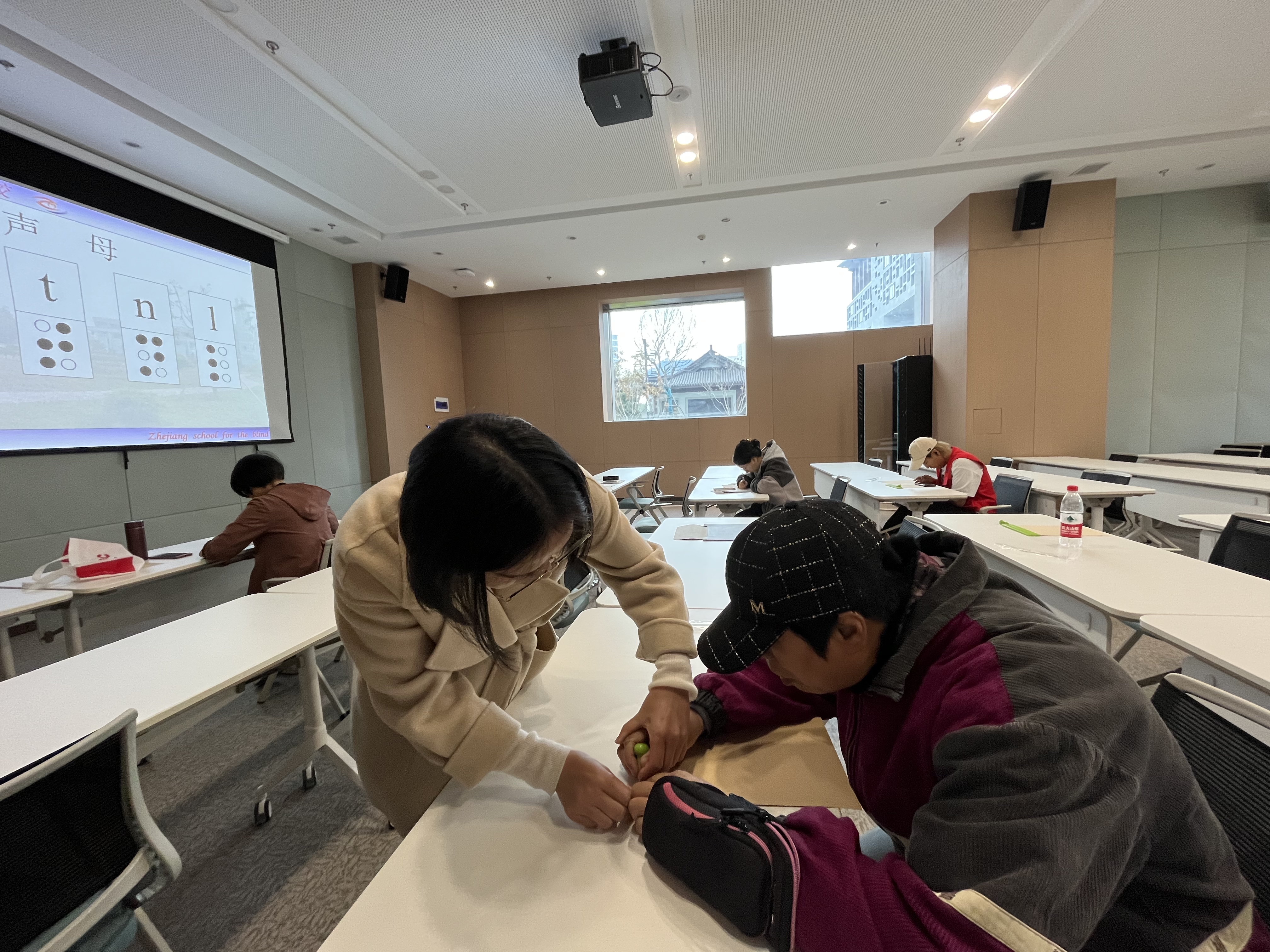 经过了第一讲关于盲文基础构成和写字原则的讲解,学员们很快进入了状态,拿出盲文写字板、装纸、握笔,各个步骤一气呵成,随后跟着老师讲授的拼音点位一点一点练习书写。