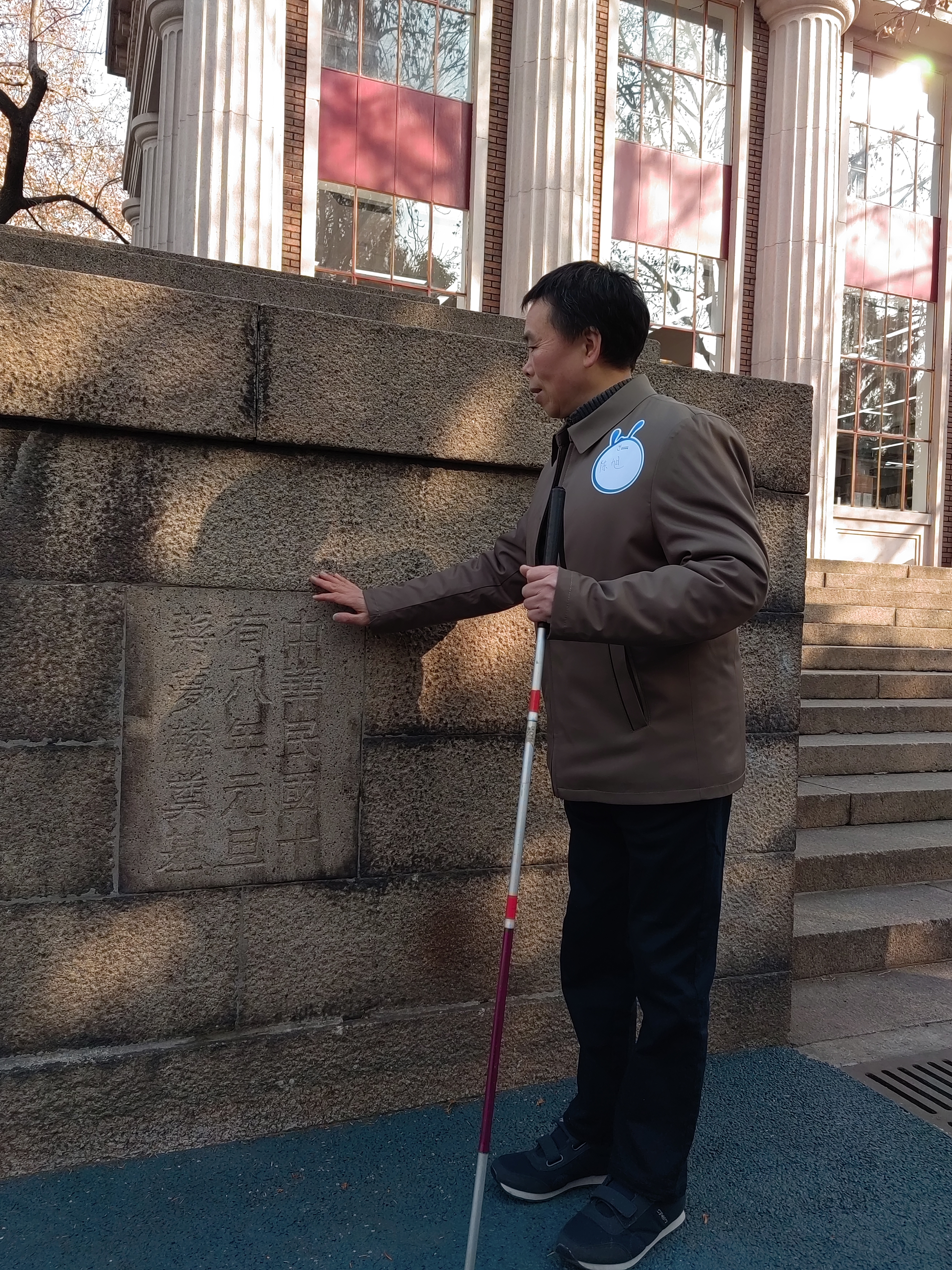 活动开始,馆员先为大家讲解了大学路馆区的历史。从1929年蒋梦麟先生奠基开工,到蔡元培先生所题的“浙江图书馆”五字墨宝,再到郁达夫先生在《水明楼日记》中的多次提及,都令视障读者和志愿者对眼前这座建筑充满敬重。不少视障读者排队在当年的奠基石前观赏,触摸石头上刻下的文字,以手指感受历史的沉淀。