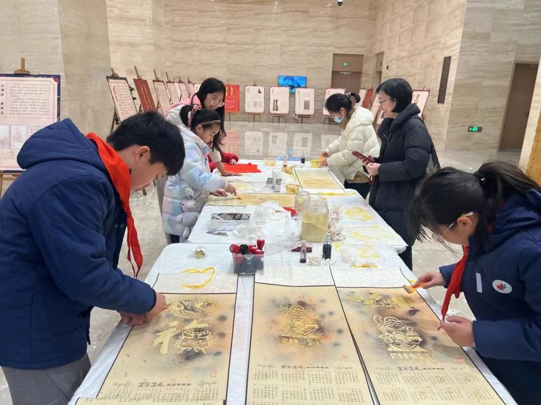 2月3日一大早,之江馆负一楼大厅早已围满了前来“寻年味”的读者朋友,下午的曙光路馆也年味十足。万字结挂饰制作、非遗草木浆染挂历制作、龙年雕版印刷体验、国风剪纸舞龙拉花制作等年味十足的非遗互动体验项目,吸引了众多读者参与。活动现场“龙”的元素和氛围拉满,每个活动都以“龙”命名,现场还有参与性极强的”一起画长卷”活动,是由之江馆和曙光路馆两馆的读者接力绘制一条新春长龙,活动特别为小读者准备,希望小读者们能够深入了解传统文化习俗。
