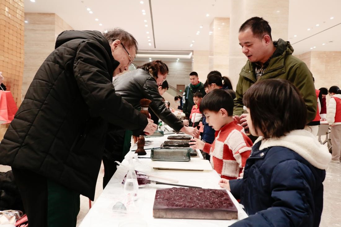 在“钱龙进宝”——龙年雕版印刷体验点,活动现场为读者提供斗方洒金红纸、雕版等材料,在非遗传承人指导下完成龙年雕版印制。为了配合今年龙年,第五批国家级非物质文化遗产代表性项目雕版印刷技艺代表性传承人黄小建专门设计了“钱龙进宝”雕版,读者都对这块雕版很感兴趣。