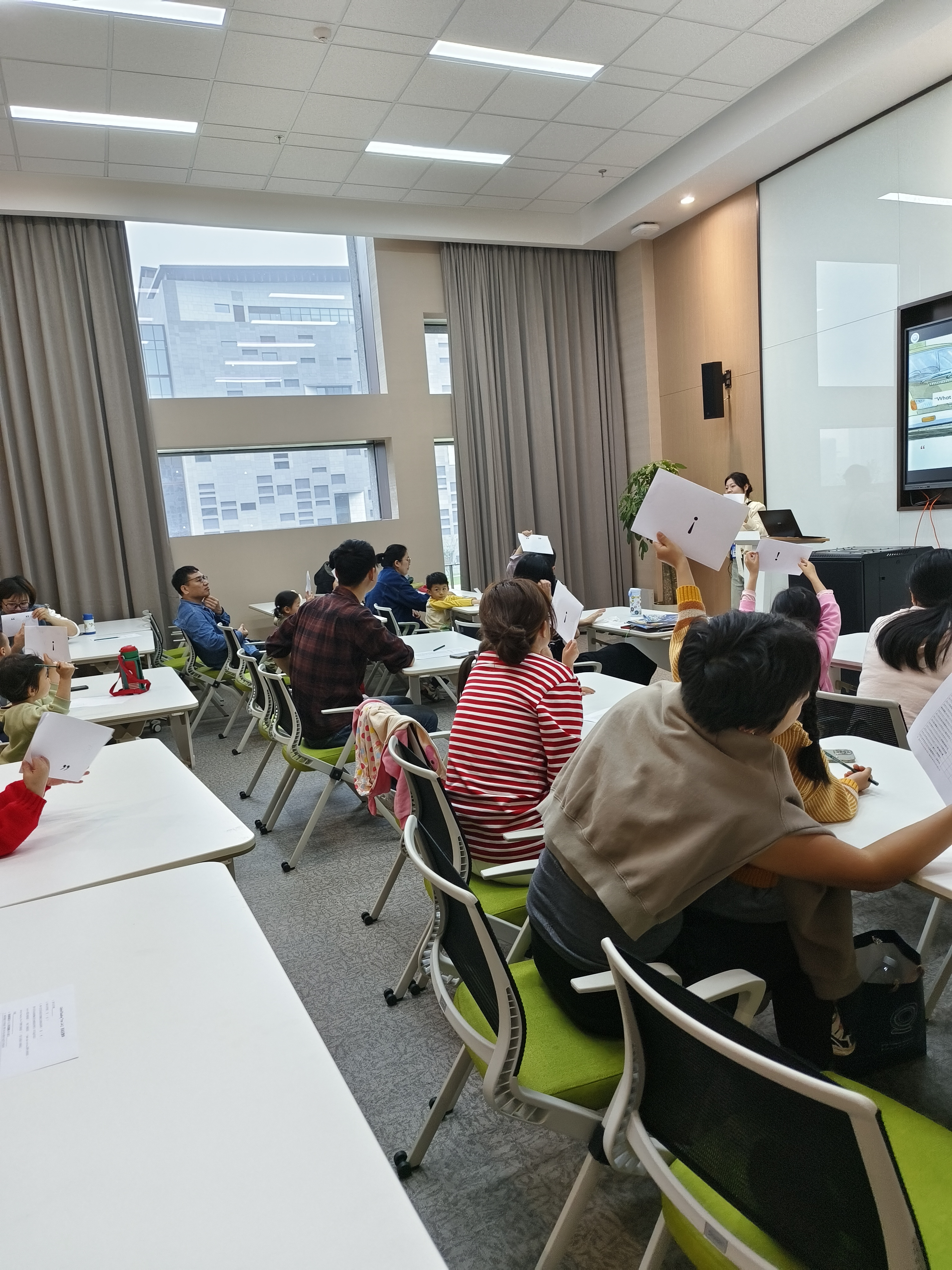 2024年4月27日上午10时,26位读者来到浙江图书馆之江馆二楼交流空间,参与The New House(《全新的房子》)的双语亲子阅读活动。本期故事与上期《待售的房子》中罗宾逊(Robinson)一家选中房子的故事相互承接,到场家庭与书中人物一起,热火朝天地开始了“搬家大工程”。