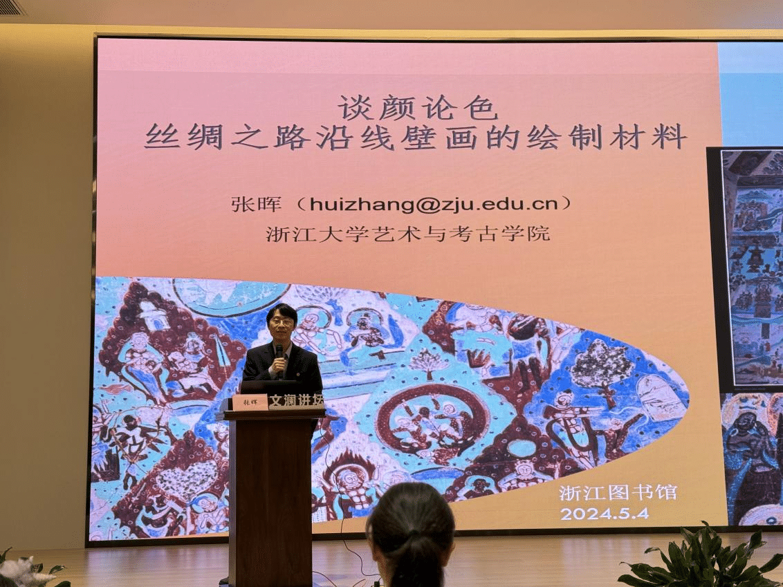 2024年5月4日下午14:00,【文澜讲坛第1245期】亚洲文明系列:《谈颜论色:丝绸之路沿线壁画的绘制材料》在浙江图书馆之江馆二楼报告厅举行。浙江图书馆特别邀请了浙江大学文化遗产与博物馆学研究所副所长、博士生导师张晖教授做客文澜讲坛,为大家带来了一场古代壁画绘制材料与技术奥秘的探索之旅。