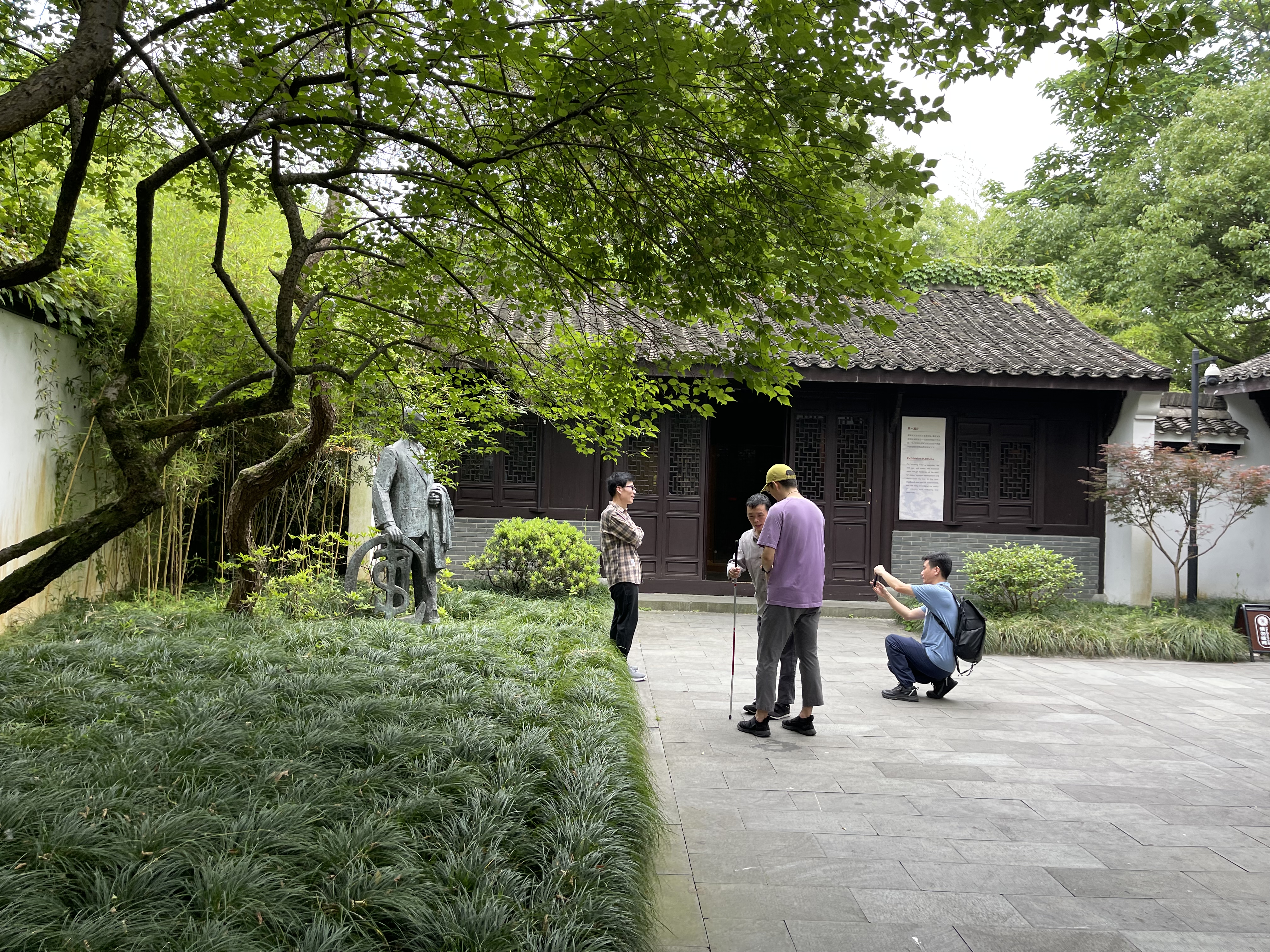 活动当天,视障读者们行走在清幽的西湖西面群山之中,沿着“上香古道”宛转于疏竹丛苇间,或是伫立在桥上感受西湖之旷,亦或是在湖畔凉亭中静坐听风。在志愿者们的带领下,大家首先参观了都锦生故居,包括祖屋、作坊、纪念堂和陈列室等建筑,在志愿者的讲解下感受这位名人先贤的创业维艰和爱国情怀。