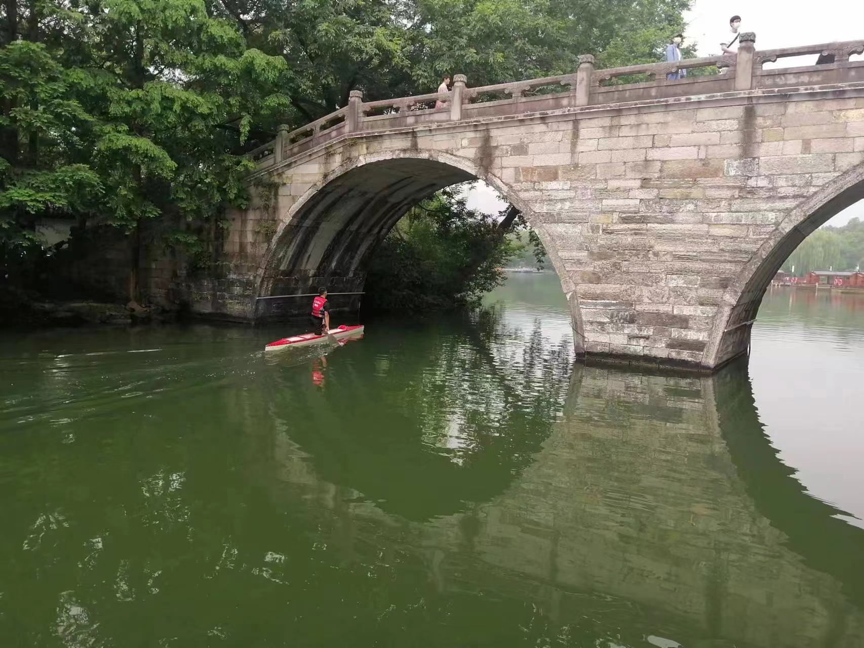 之后,沿着湖边石板路,视障读者们行至玉涧桥上,在志愿者的描述中感受远处的湖光山色,纷纷拿出手机记录当下的风景。接着拾级而下,来到湖边凉亭“黛色参天”,置身于绿水绿树之中,透过玉涧桥的拱洞欣赏不一样的风景,将来往的游船、赛艇画面定格。最后,视障读者们在志愿者的引导下,沿着木板铺成的湖边小路,欣赏湖中盛放的睡莲,感受裹挟在微风中的丝丝清香。