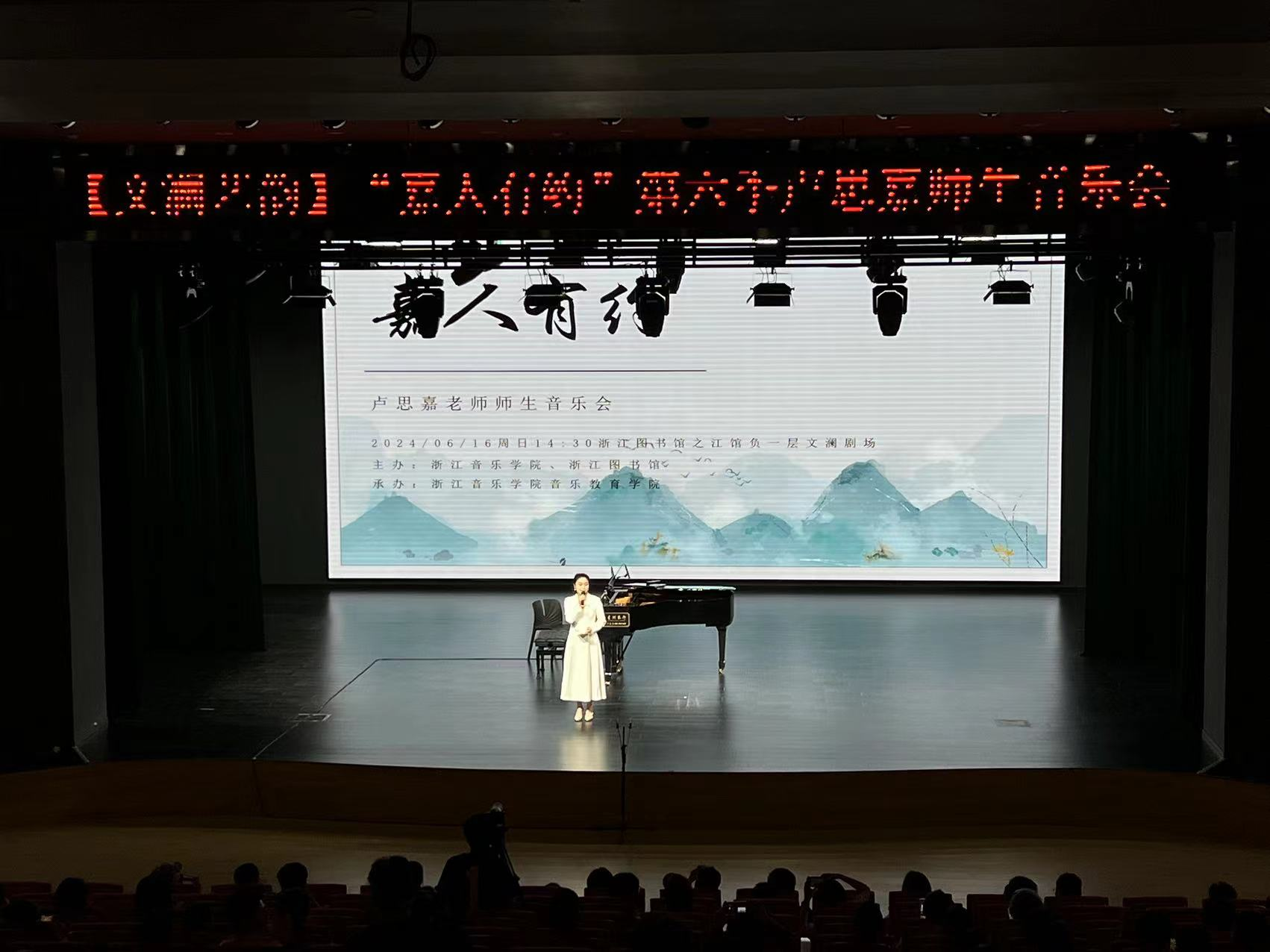 2024年6月16日下午14:30,浙江音乐学院音乐教育学院的卢思嘉老师应浙江图书馆之邀,在浙江图书馆之江馆负一层的文澜剧场举办“嘉人有约”第六季音乐会。本场音乐会由卢思嘉老师携手其学生共同呈现,精心挑选了18首涵盖不同风格与时期的中外歌剧选段及艺术歌曲,旨在为听众带来一场丰富的音乐之旅。其中,特别值得一提的是2023年原创的古风新作《阡陌江南》。这首作品以江南水乡的柔美风光为创作源泉,延续了“中国风”的独特韵味,由卢思嘉老师与特邀嘉宾袁天翼同学共同演绎,为观众带来了耳目一新的体验。整场音乐会以高水准、严要求著称,为到场的每一位观众呈现了一场难忘的视听盛宴。
