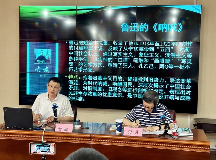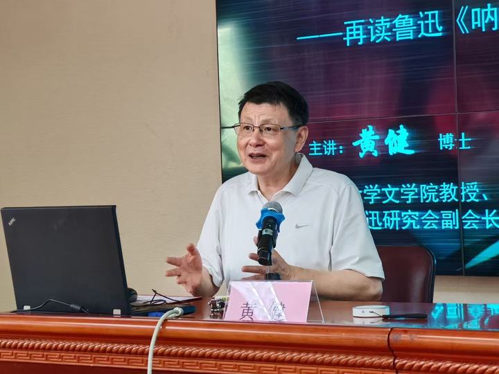 黄健教授重点解读了《呐喊》中的《狂人日记》。《狂人日记》通过被迫害者“狂人”形象以及他自述式的描写,揭示封建礼教的“吃人”本质,表现出对以礼教为主体的旧制度、旧思想、旧道德、旧文化的批判。鲁迅以启蒙主义思想,对旧文化进行了深刻反思,由此发出“救救孩子”的呐喊,忧愤深广,振聋发聩,同时也寄希望于未来和青年。黄健强调,《狂人日记》中描写的“吃人”是迄今为止对封建旧制度、旧思想、旧道德、旧文化最为形象的概括和认识。“吃人”并非消灭人的肉体,而是将人变成“非人”,剥夺了人的思想、精神和个性。这表现出鲁迅对国民劣根性的最为深刻的批判思想和精神。《呐喊》以鲜明的笔触和独特的视角,揭示了旧制度、旧思想、旧道德、旧文化的黑暗面,由此进行了深刻的批判,同时也展现了希望及其对人性(国民性)的思考和关怀。而《狂人日记》“以表现的深切和格式的特别”震撼整个文坛,激动人心。它是五四新文学的总序,是“文学革命”的“实绩”,为新文学创作的“一发而不可收”作了示范,展示了新文学鲜明的思想性和艺术性。