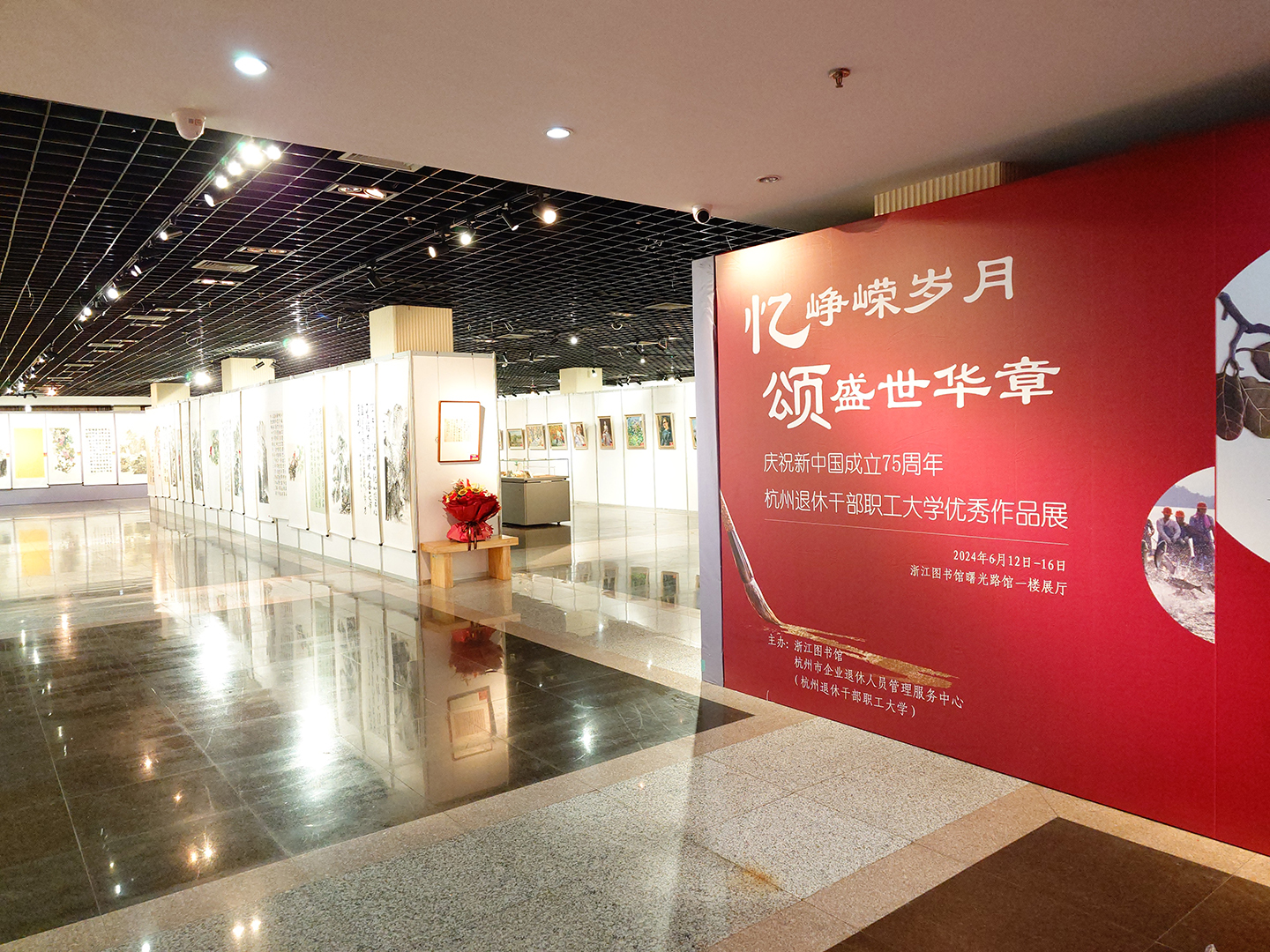 2024年是中华人民共和国成立75周年,也是杭州市企业退休人员社会化管理实施20周年。为表达对党和国家的热爱与祝福,传承和弘扬中华优秀文化,同时展示退休干部职工的艺术才华,浙江图书馆联合杭州市企业退休人员管理服务中心(杭州退休干部职工大学)于6月12日至6月16日,在浙江图书馆曙光路馆展厅举办“忆峥嵘岁月,颂盛世华章——庆祝新中国成立75周年优秀作品展”。