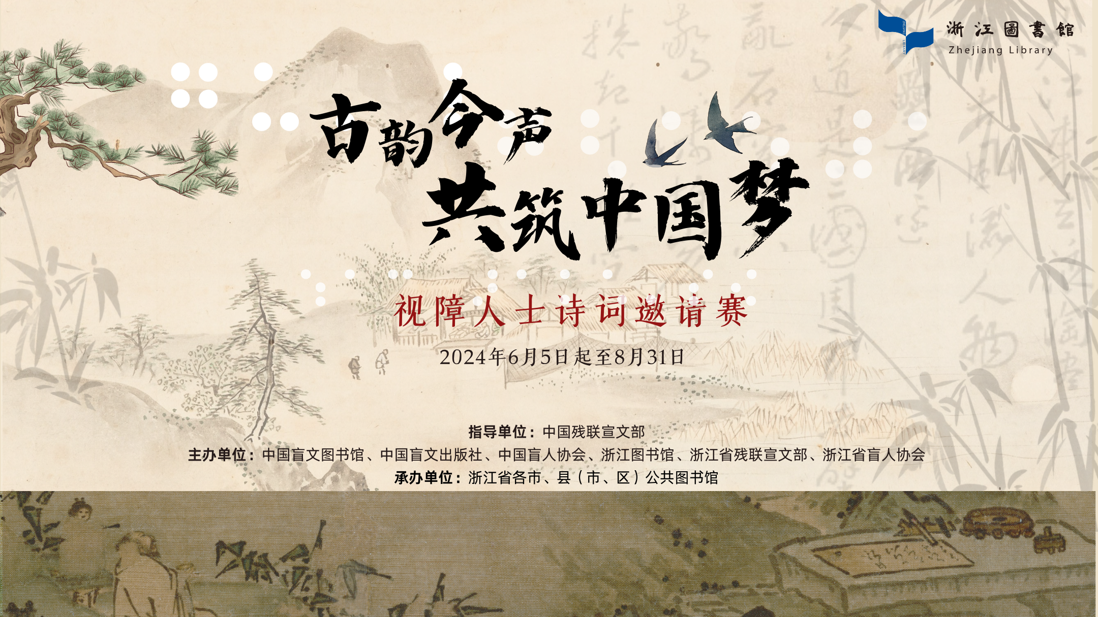 由中国残联宣文部指导,中国盲文图书馆、中国盲文出版社、中国盲人协会、浙江图书馆、浙江省残联宣文部和浙江省盲人协会联合主办,浙江省各市区县公共图书馆承办的“古韵今声 共筑中国梦”视障人士诗词邀请赛浙江赛区比赛自2024年6月18日正式启动,参赛选手经过在线练习模式的积累,于7月6日正式完赛。
