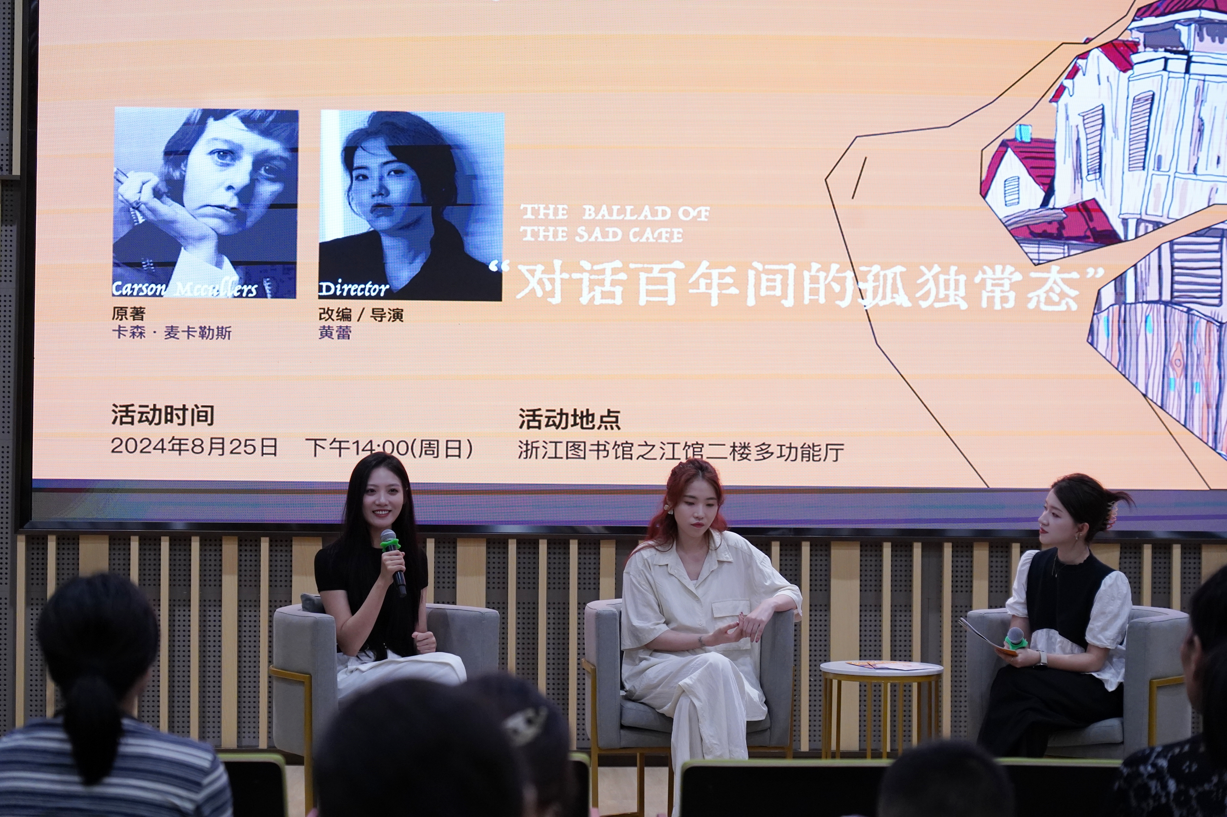 8月26日下午,浙江图书馆之江馆开展了一场关于“百年间孤独常态”的对话,邀请了本剧的导演黄蕾和主演杨铭淇,与百位读者朋友们分享卡森·麦卡勒斯经典小说《伤心咖啡馆之歌》的阅读体验和感悟,分享将小说改编成舞台剧的心路历程。同时,带领读者朋友们共同对话百年间的孤独常态,近距离感受经典著作《伤心咖啡馆之歌》从小说文字到戏剧舞台的演变,关注当下社会发展的共性问题,多视角感受文学艺术的多样魅力。