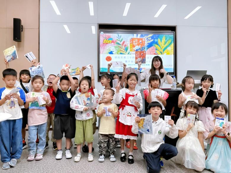 在小书基本制作完成后,苗苗老师为大家的小书盖上了图书纪念章,并邀请小读者们上台展示自己的小书,还为他们准备了赠书福利。活动最后,大家合影留念。