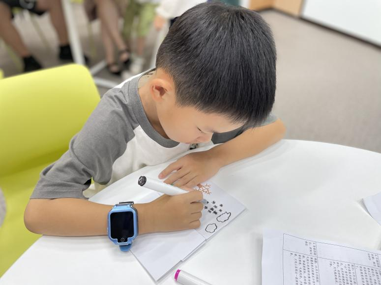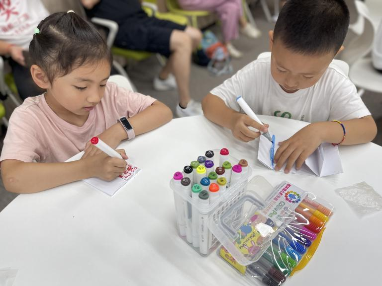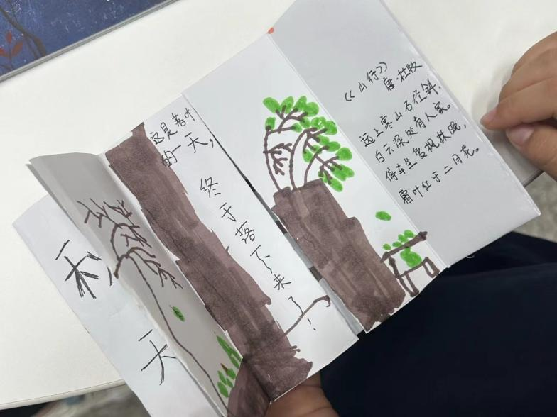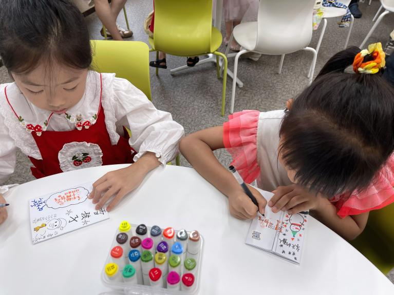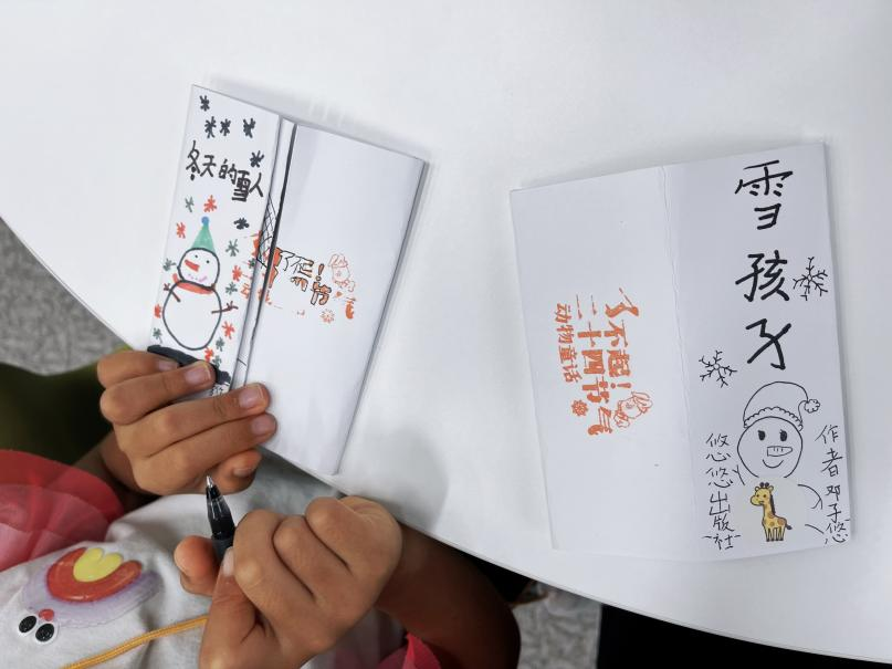接下来,苗苗老师带领大家将一张纸进行折叠和裁剪,随后得到小书的原型,接着便可以用彩笔在书上创作自己想加入的与节气有关的内容。有的小读者写起了刚刚分享过的节气诗词,有的小读者细致地画上了不同节气的动物和风景,有的小读者用可爱的动物贴纸装饰起了自己的小书,还有的小读者发挥想象力和创意,创作出了二十四节气故事连环画,充分展示了童心与个性。