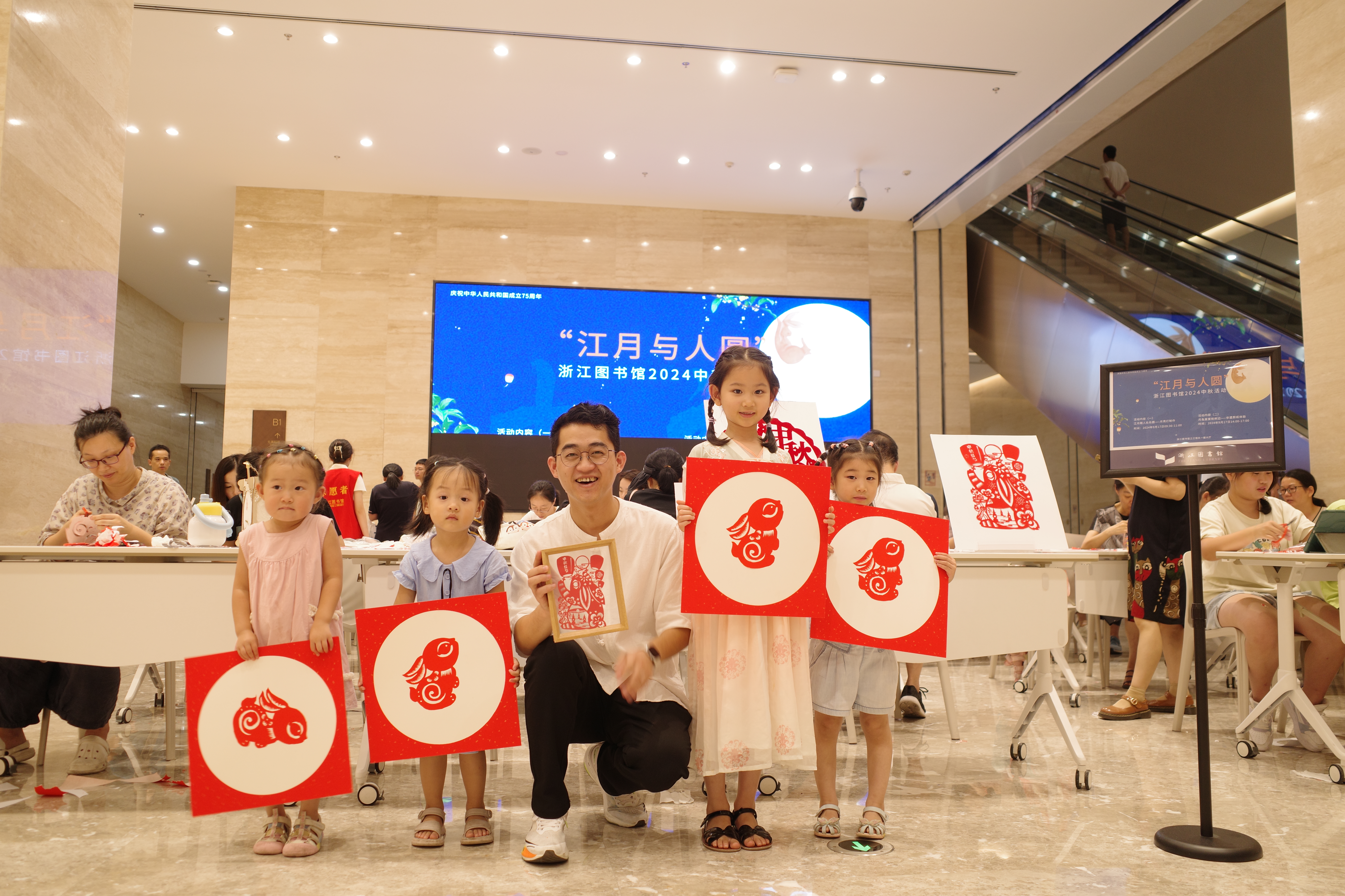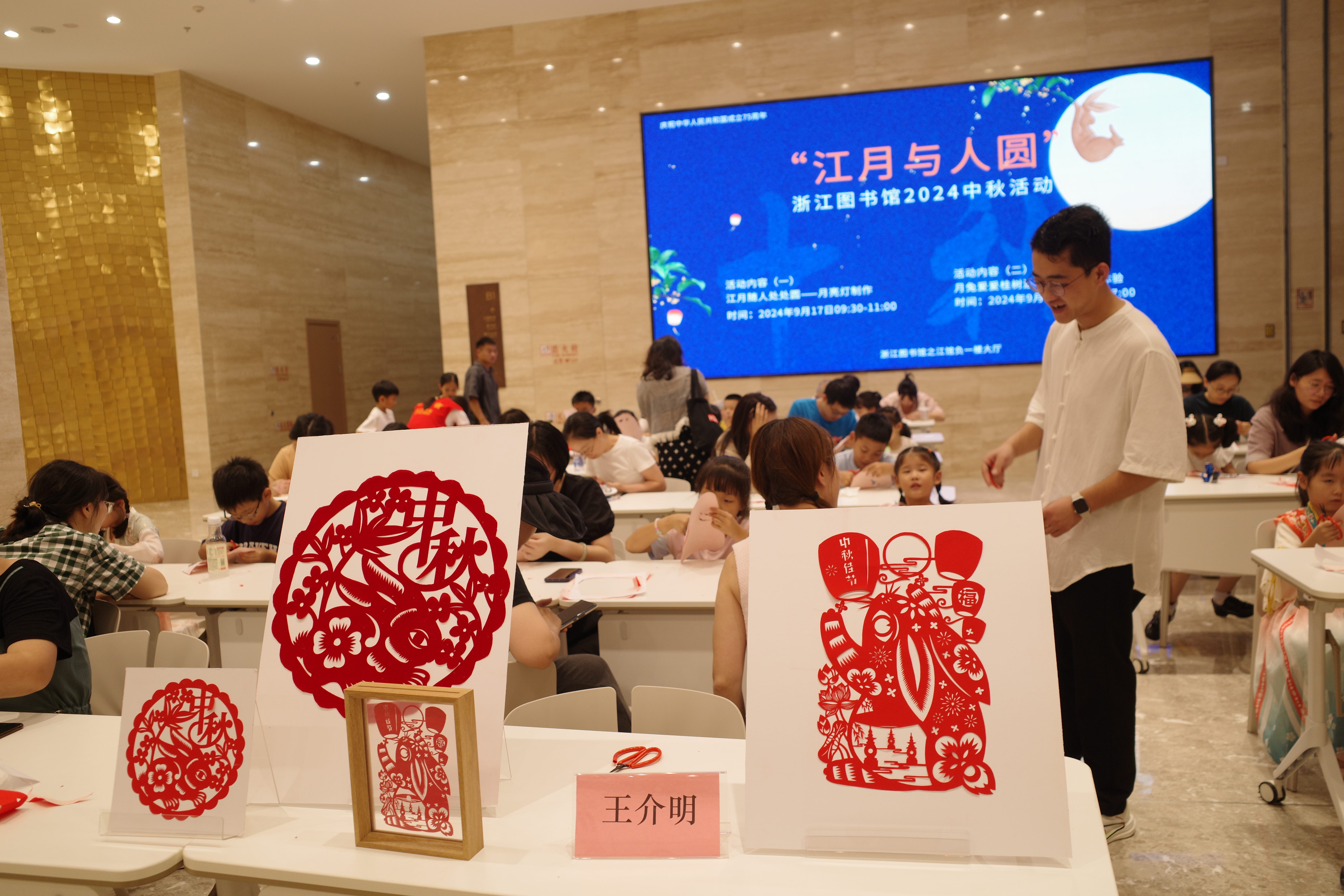 9月17日中秋佳节,也正值喜迎中华人民共和国成立75周年之际,浙江图书馆在之江馆举办文澜社会大课堂系列“江月与人圆”中秋国庆特辑活动。其中下午的“月兔爰爰桂树边——非遗剪纸体验”吸引众多家庭参与,参与者们在浓厚的节日氛围中共享月满之时、感受家国温暖。