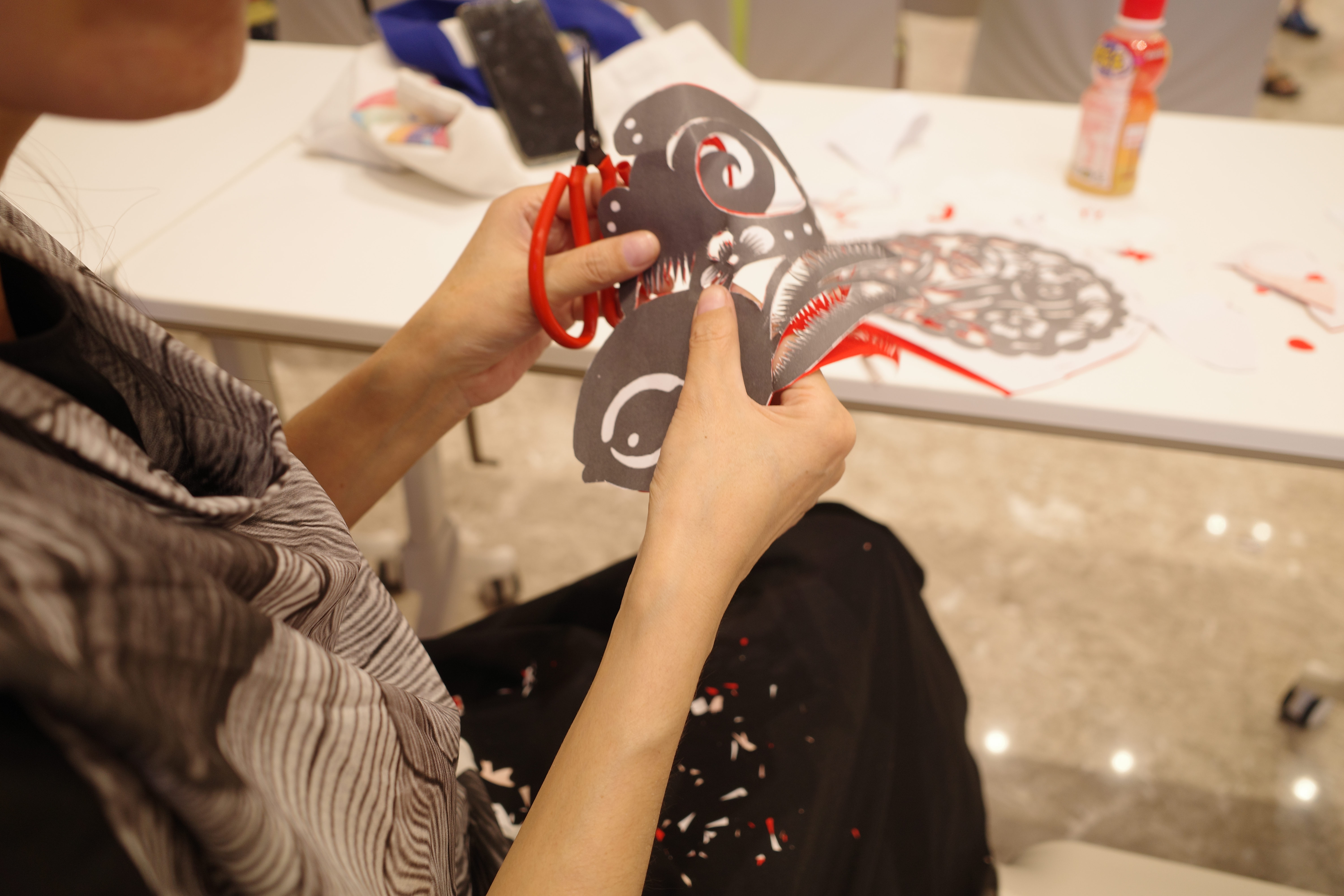 随后,大家人手一把剪刀,实践起了”稳、准、巧”的刀法,运用巧刀刻出月兔形象中的“锯齿”和”月牙儿”,一张红纸就变成了层次分明和形象灵动的吉祥物。