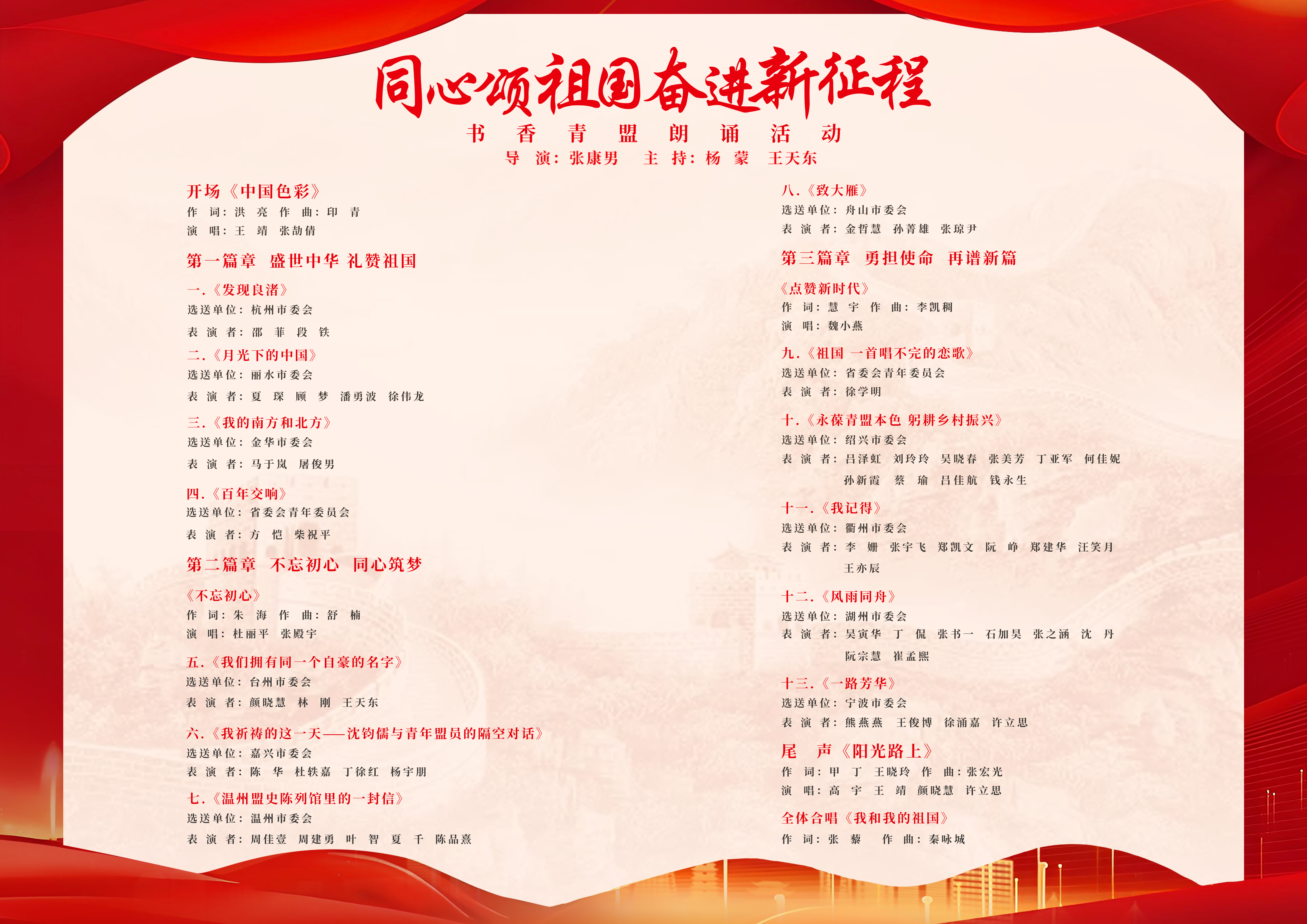 活动在一曲《中国色彩》中拉开帷幕。演出分为“盛世中华 礼赞祖国”“不忘初心 同心筑梦”“勇担使命 再谱新篇”三个篇章,采用独诵、对诵、集体朗诵、表演朗诵等多种朗诵形式,并结合歌曲舞蹈等艺术样式,热情歌颂新中国成立75周年来的辉煌成就,重温回顾民盟与中国共产党共克时艰、共历风雨、共同前进、共襄伟业的光辉历程,充分彰显民盟人为国履职、为民尽责的时代风采。节目集政治性、艺术性与观赏性于一体,精彩纷呈,励志感人,引发现场阵阵掌声。活动在《我和我的祖国》大合唱中落幕。
