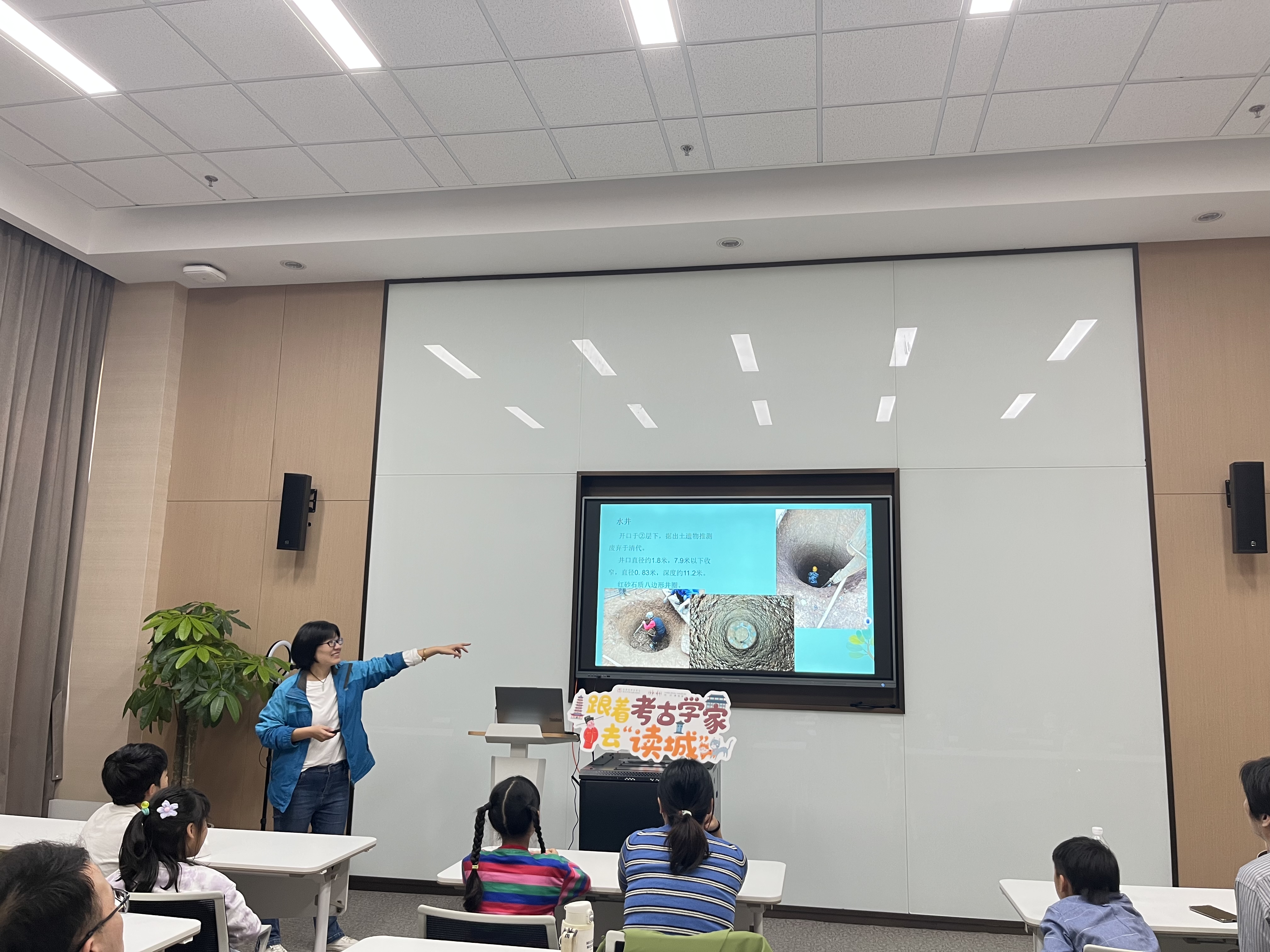 在介绍临安城的供水系统时,孙媛老师展示了位于杭州市上城区紫城巷的发掘现场的图片,几百年前的木管砖井供水系统,引西湖水作为城内淡水使用,设计科学、制作精妙,引得现场小朋友和家长为古人的智慧赞叹不已。