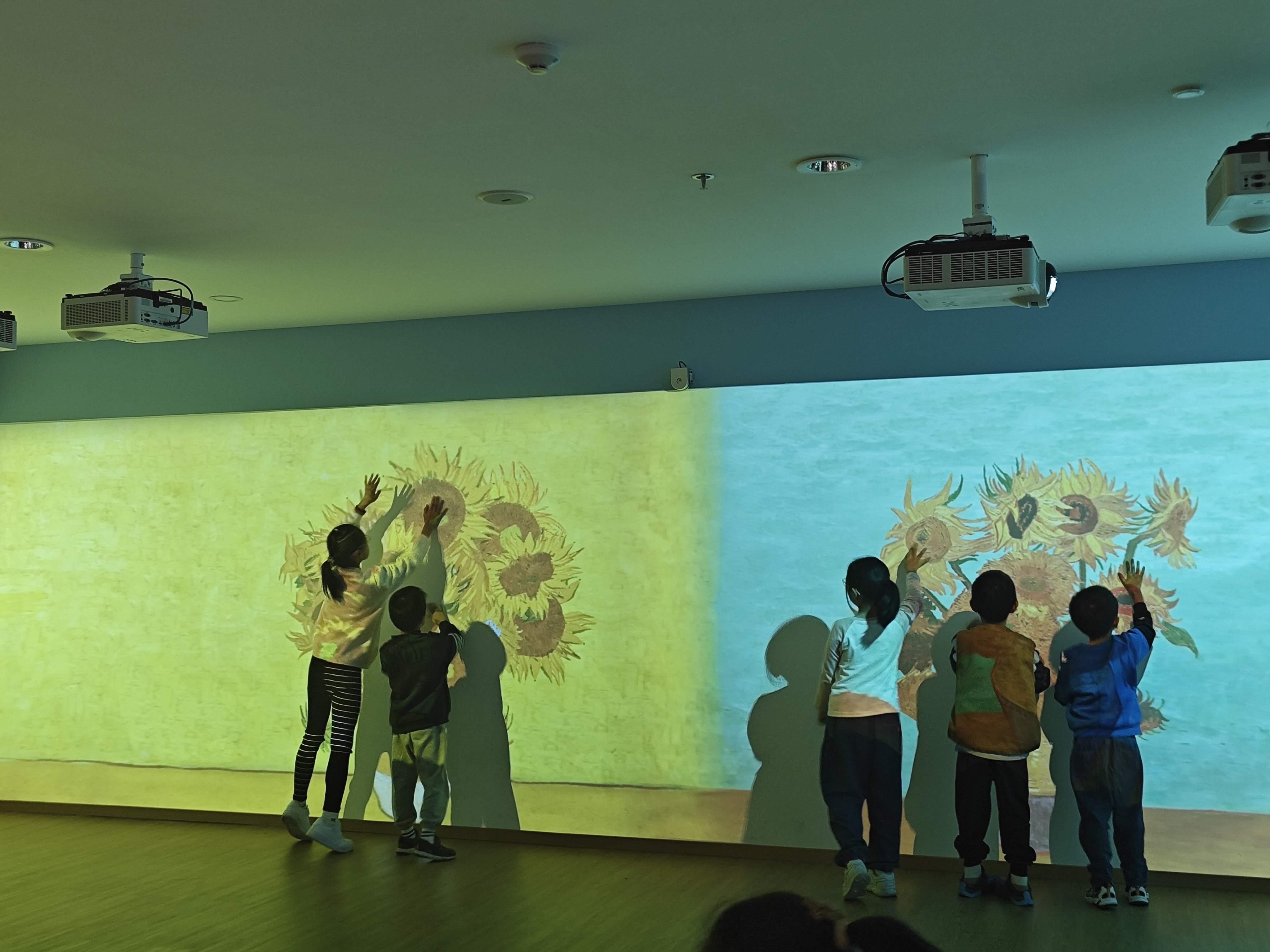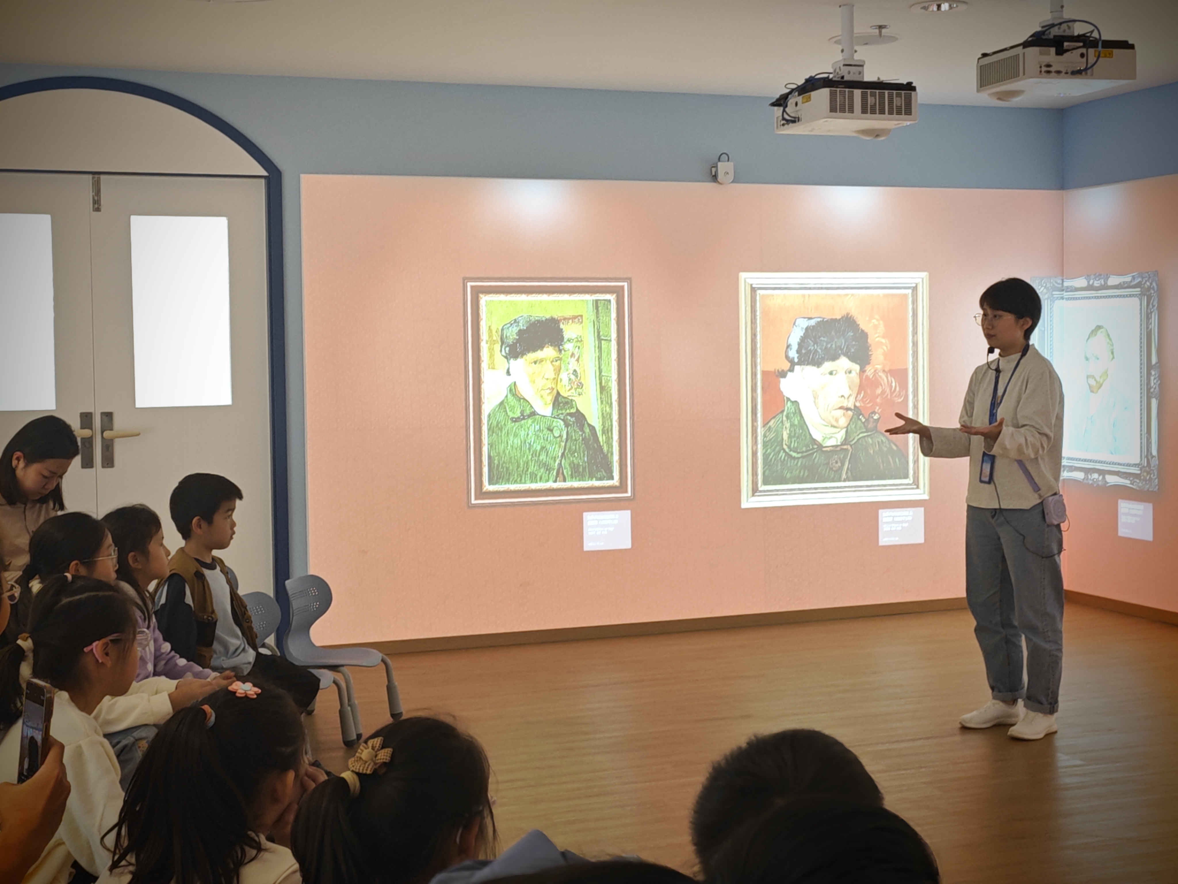 在主讲馆员的细致解说和全景展示的辅助下,小读者们聚精会神地观察每一幅画作,他们敏锐地捕捉到了梵高在色彩运用和内容表达上从早期到晚期的转变。通过对《星月夜》《黄房子》《向日葵》等经典作品的深入赏析,读者们不仅感受到了梵高作品中的情感深度和精神追求,也揭开了这位伟大艺术家鲜为人知的一面。