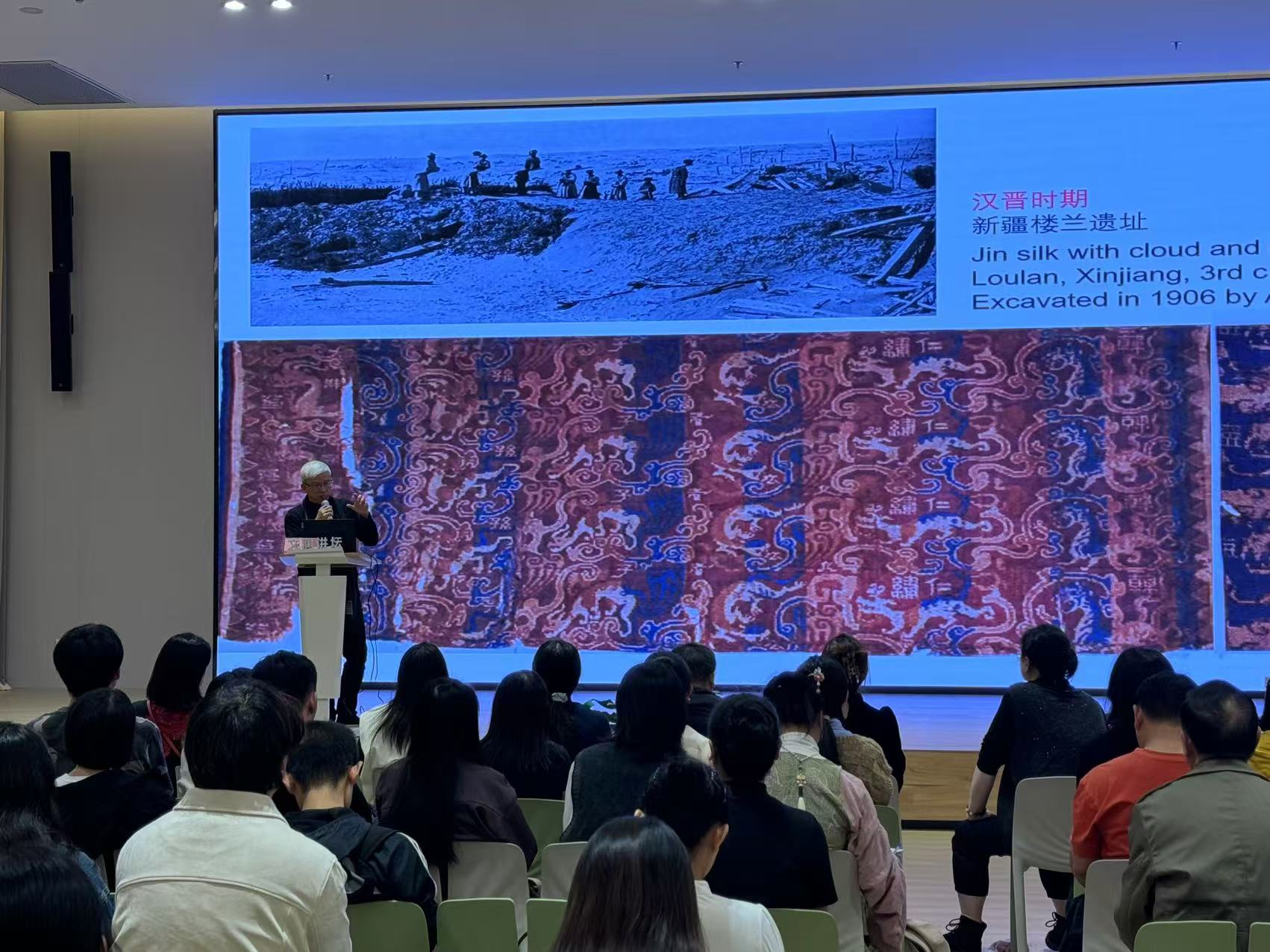 接着,赵丰院长展示了中国各时期丝绸遗存,并详细分析了丝绸遗存中所蕴含的历史与文化,带领听众一齐领略东西方文化交流在丝绸中的具象化体现。