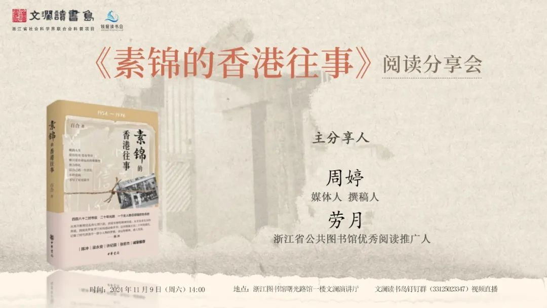11月9日下午,文澜读书岛第168期《素锦的香港往事》阅读分享会在浙江图书馆曙光路馆文澜演讲厅举行。本书以素锦和妹妹素美之间的真实通信为基础,细致描绘了素锦在香港20年的日常生活细节和悲欢离合往事。