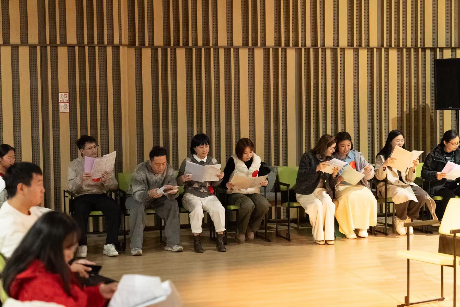 活动开始前,徐老师为每一位想参与读剧的读者们进行试音,根据每一位读者的音色等特点,为读者们分配角色。正式开始读剧前,还带领所有读者们一起念幕间戏开嗓热身。
