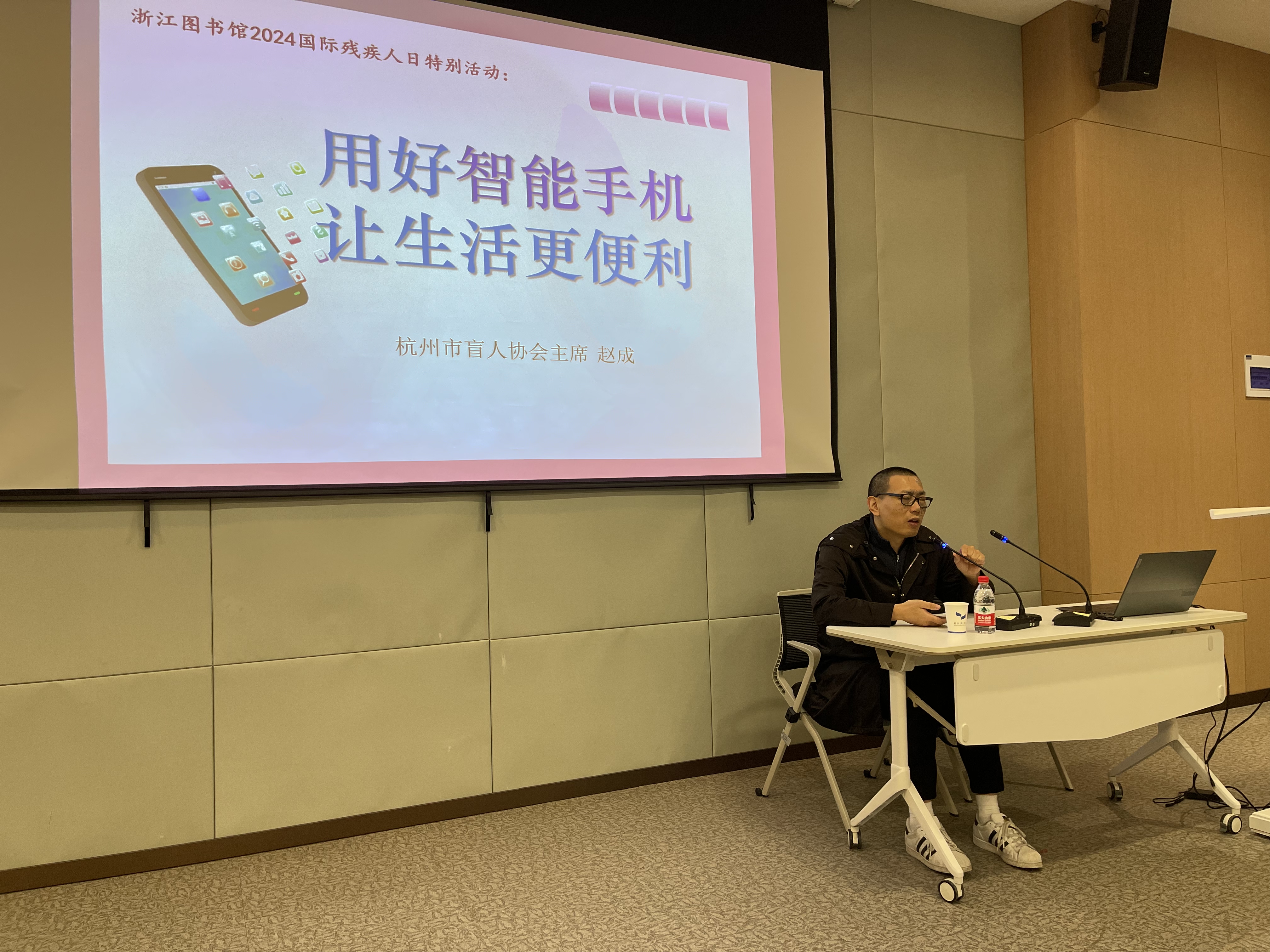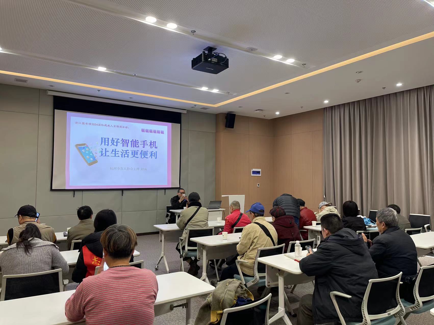 2024年12月3日是第33个国际残疾人日。为更好帮助视障读者使用智能手机,方便日常生活和出行,在第33个国际残疾人日到来之际,浙江图书馆特别邀请杭州市盲人协会主席赵成,于12月4日上午在之江馆无障碍阅览区培训教室开展主题为“用好智能手机 让生活更便利”的视障人士智能手机APP(应用程序)培训。近20位视障读者参与了此次活动。