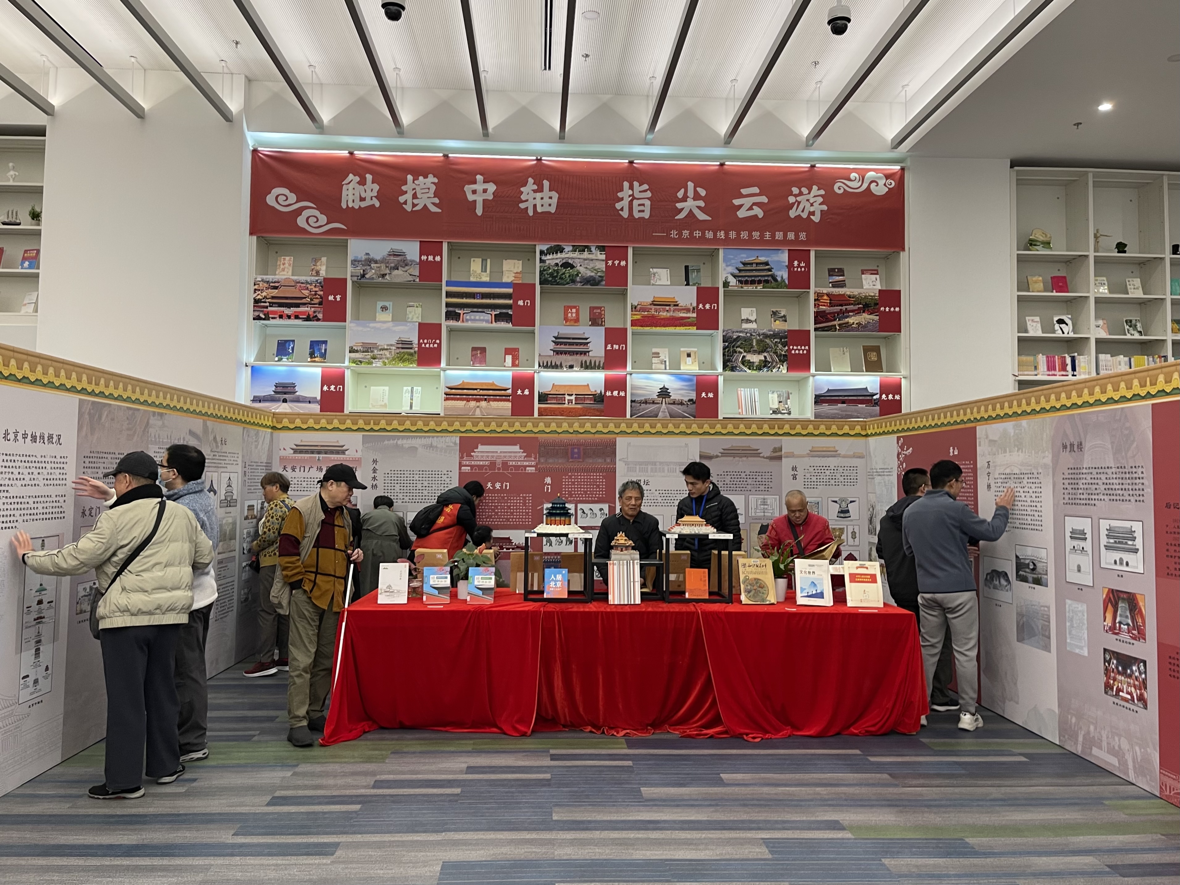 活动结束后,视障读者在工作人员的引导下来到综合借阅区参观“触摸中轴,指尖云游——北京中轴线主题非视觉展览”,通过触摸展板上的凹凸点字和展架上的模型,感受北京中轴线这一新晋非遗文化的魅力。