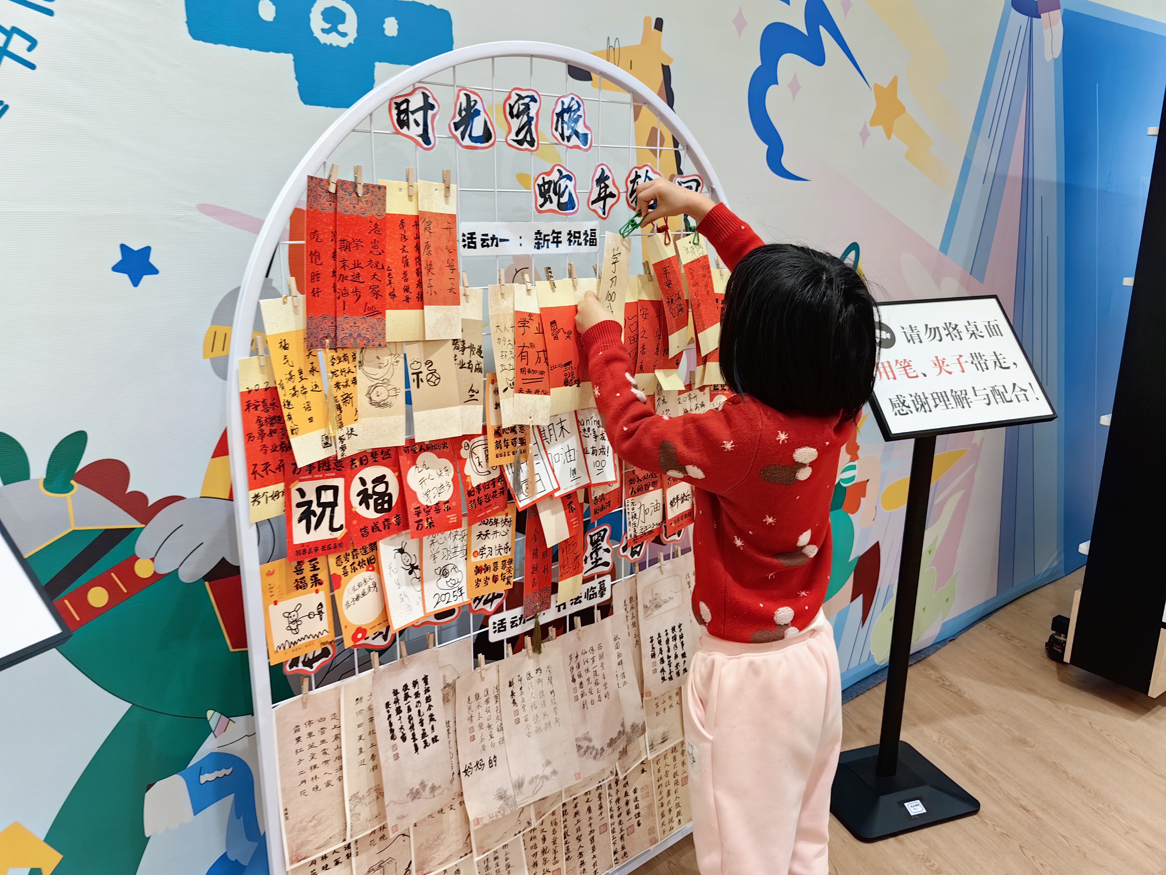 “龙腾蛇舞 墨香四溢”书法临摹活动带领读者领略汉字之美。活动现场提供经典诗词临摹卡片,不少家长与孩子共同执笔,感受笔尖流淌的千年文化底蕴。优秀作品同步展示于许愿墙旁,形成了一道独特的艺术风景线。