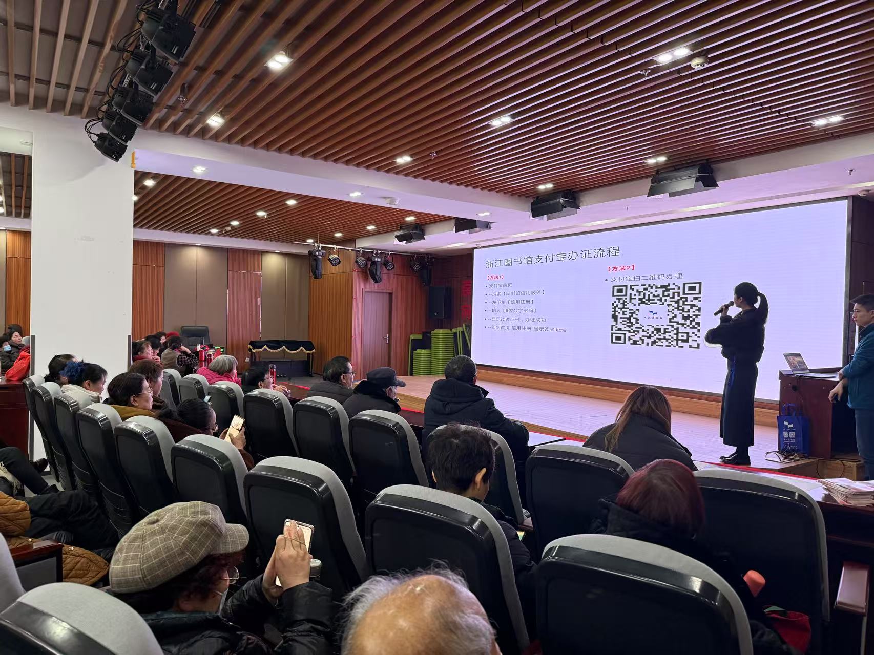电影放映前,通过观看浙江图书馆宣传片展示浙江图书馆之江馆的建设情况、馆藏资源、数字化服务等内容。随后,浙江图书馆工作人员手把手指导现场读者使用支付宝办理电子读者证,让不少首次接触数字服务的老年人成功解锁“掌上图书馆”。