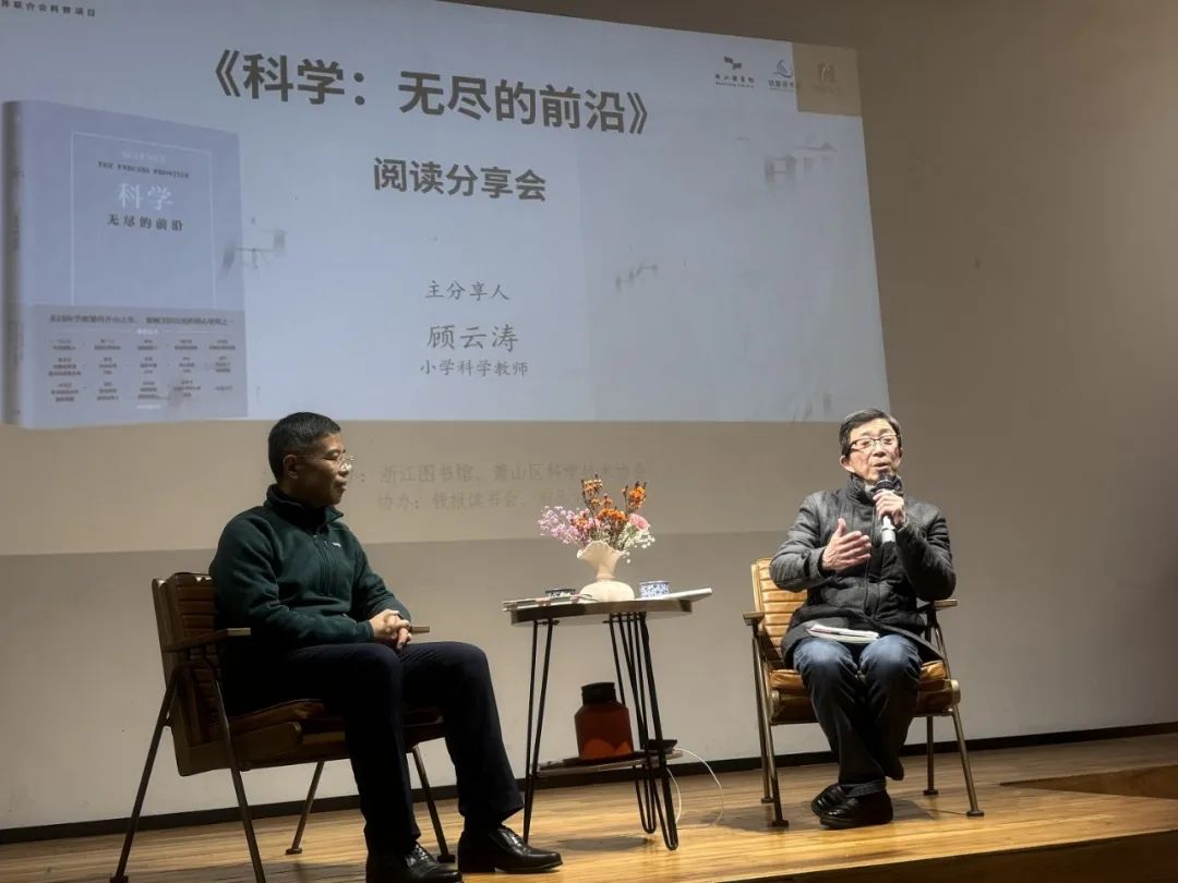 2025年2月22日下午,由浙江图书馆、萧山区科学技术协会联合主办,钱报读书会、淘品文化协办的《科学:无尽的前沿》阅读分享会在萧山区东巢文化公园野渡创造社举办。小学科学老师顾云涛作为主讲嘉宾为大家分享了美国科学家范内瓦·布什和拉什·D·霍尔特的《科学:无尽的前沿》。