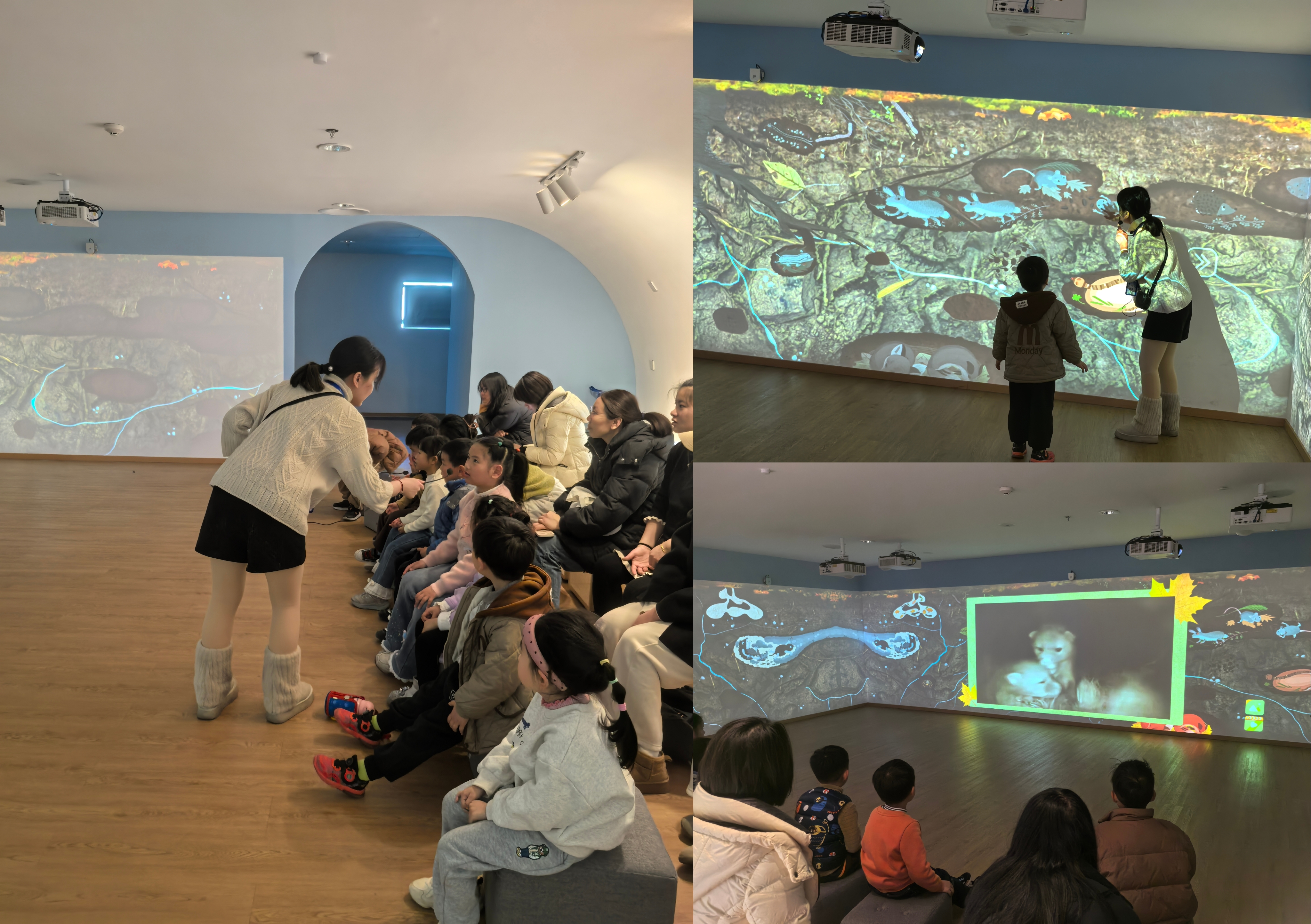 2025年3月8日下午,18位小读者和家长朋友在浙江图书馆之江馆二楼的光影阅读星球参与“泥土里有什么”主题阅读体验活动。共同在三面环绕屏幕所营造的沉浸氛围下,走进森林与沙漠两类生态系统中,认识孕育无数独特生物的土壤王国,并通过实景音视频的观赏,具体地了解不同生物各自的习性。